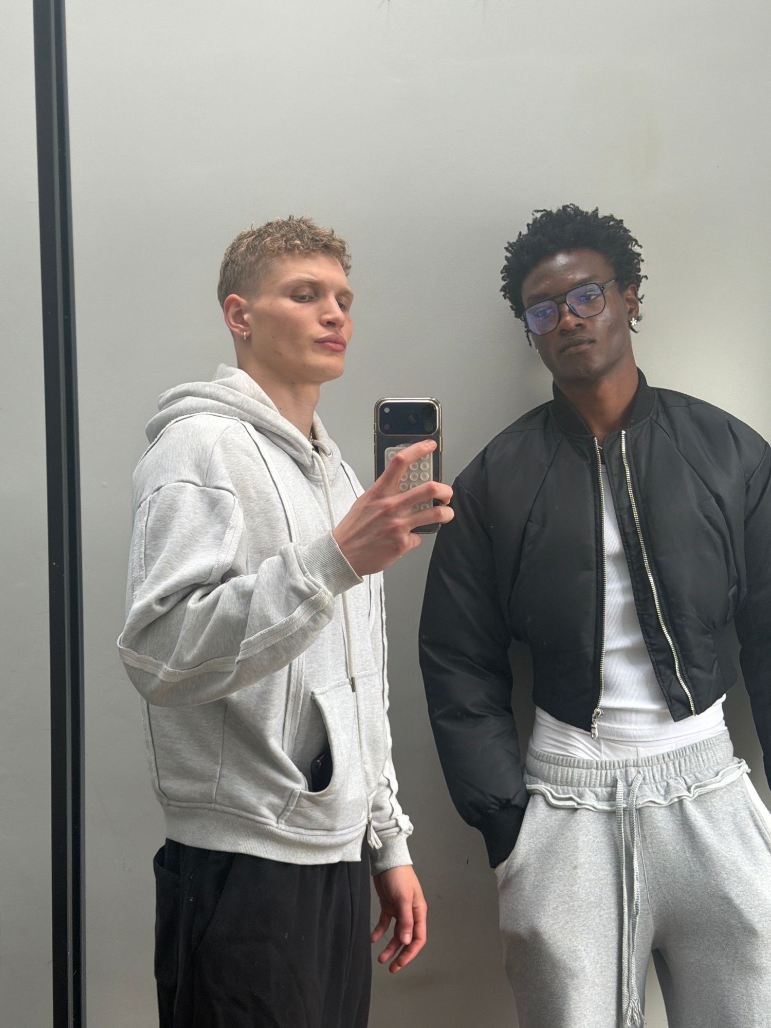 Two males are captured in a mirror selfie against a plain, light-colored wall in what appears to be an indoor setting in London, United Kingdom. In the foreground, on the left side of the frame, stanβ¦read more