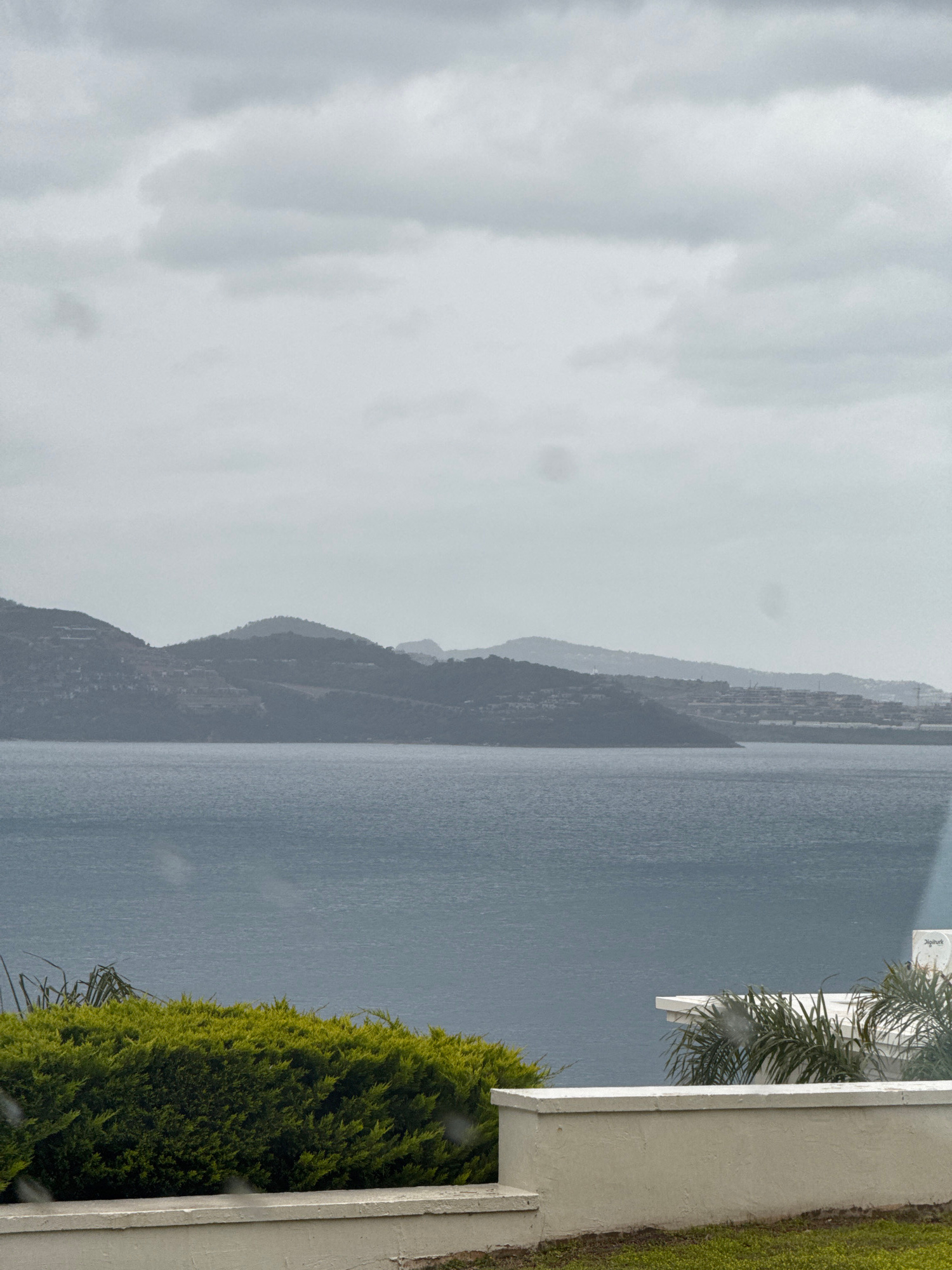 The image shows a landscape scene, possibly from a window or balcony, likely on a rainy or overcast day. A body of water fills the middle of the frame, with visible raindrops on the surface. Across th…read more
