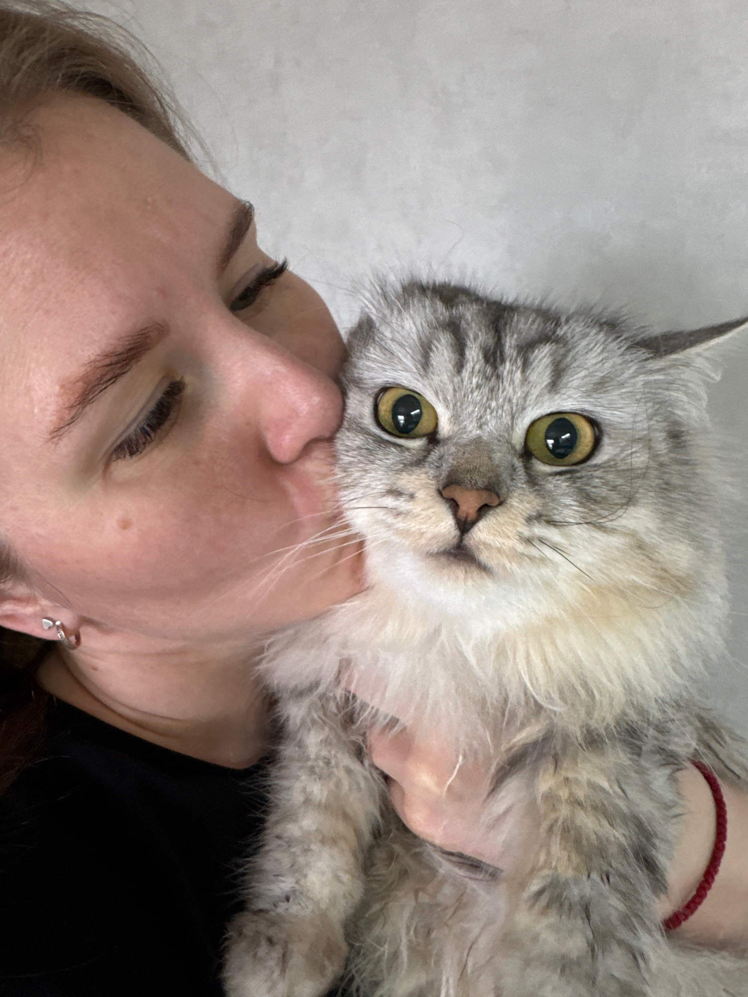 A woman is holding a grey and white cat close to her face. The cat is a fluffy breed with striking green eyes. The woman's eyes are closed, and she appears to be nuzzling the cat. They are indoors. Th…read more