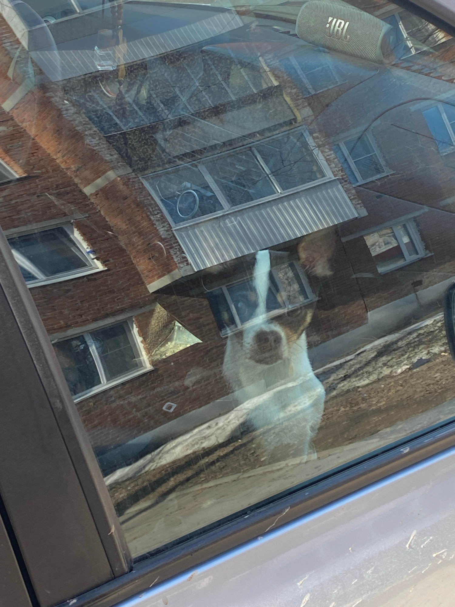 The image depicts a reflection in a car window, showing a building across the street. The building is a brick structure with multiple windows, some covered by blinds. A JBL speaker is visible inside t…read more