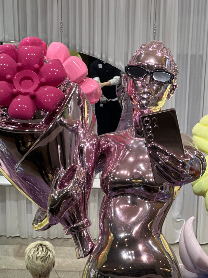 An indoor, eye-level photograph captures a large, highly reflective, rose-gold metallic sculpture of a stylized female figure. The sculpture, exhibiting a smooth, mannequin-like form, wears dark recta…read more