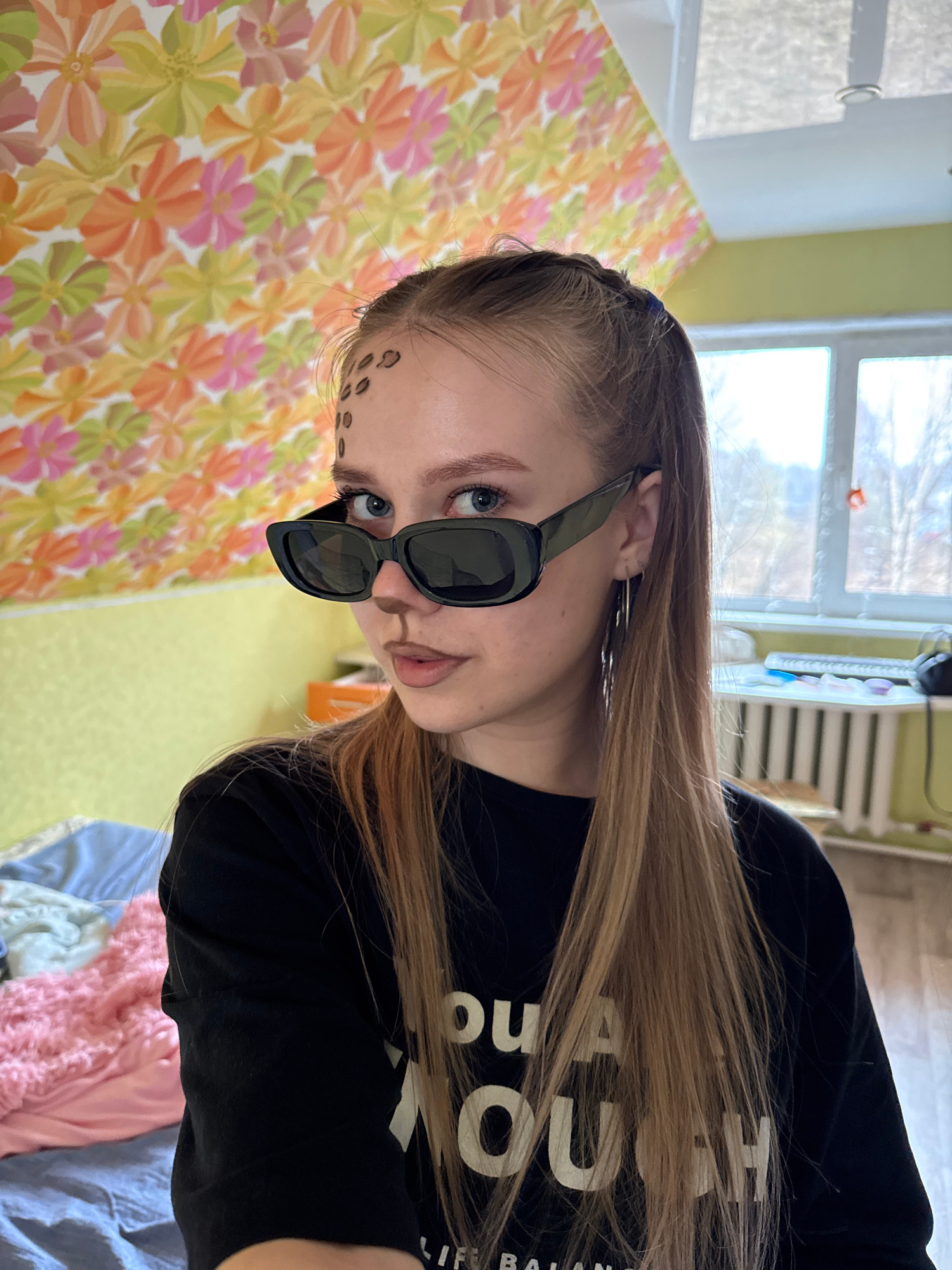 A young woman is featured in a close-up indoor portrait, taken with a tilted perspective. She has long, straight, light brown hair and blue eyes, partially obscured by dark, rectangular sunglasses. Di…read more