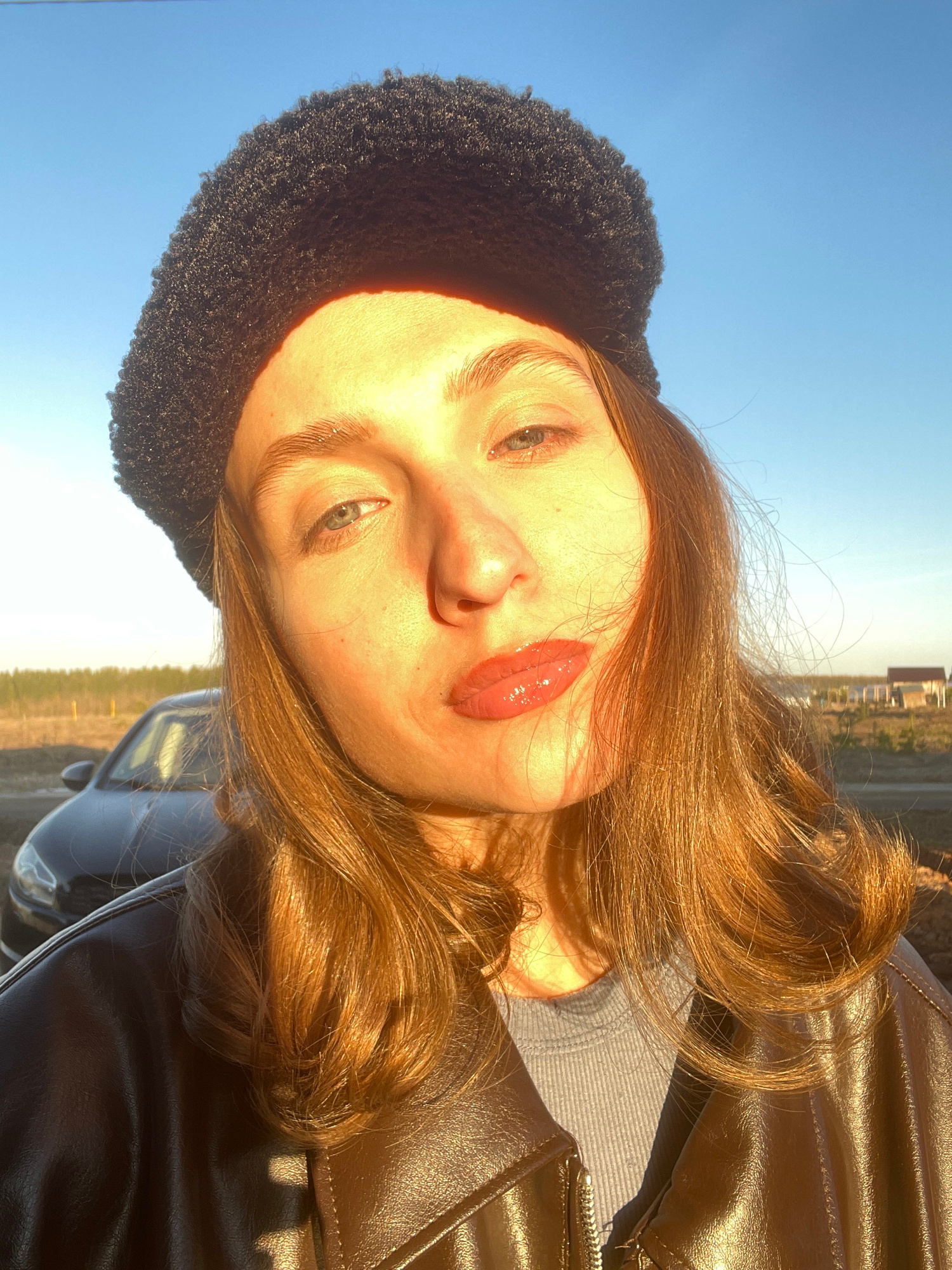 A brightly lit, close-up, and slightly tilted portrait captures a young individual outdoors. The subject, likely female, has fair skin, light-colored eyes (appearing greenish-blue), and long, wavy red…read more
