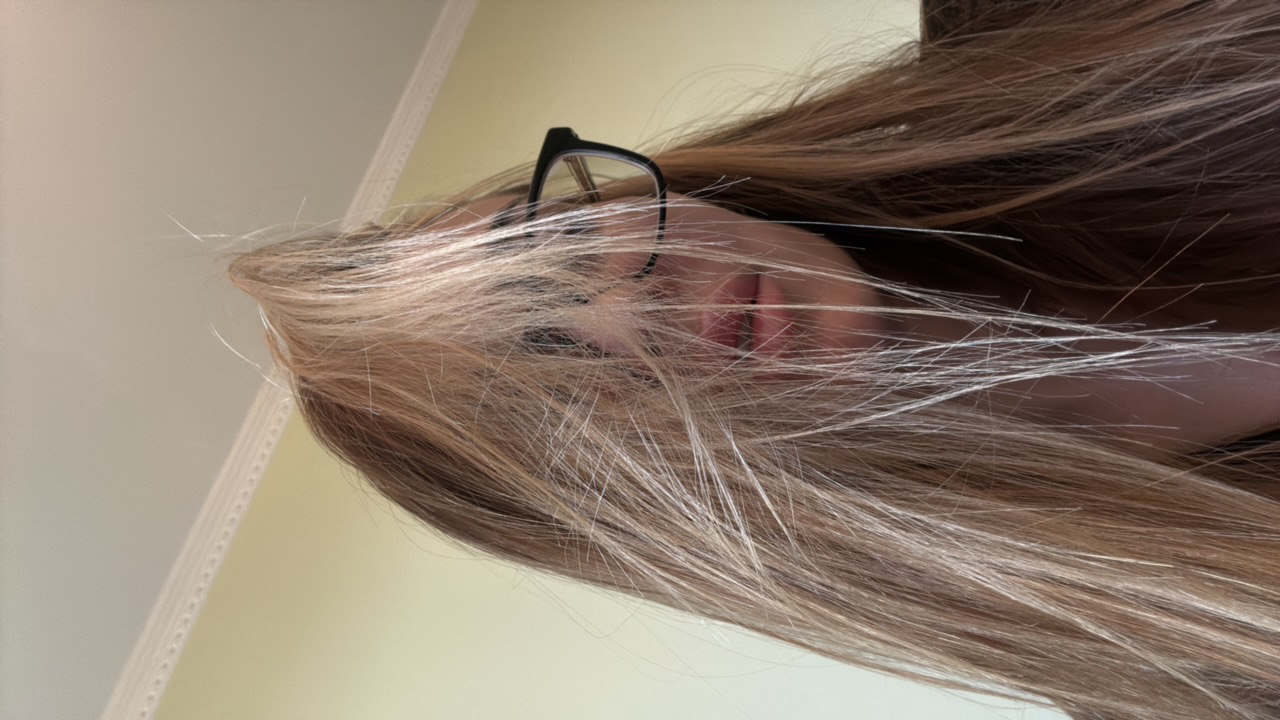 A blonde woman with sun glasses takes a selfie in front of a cloudy sky. She is wearing a black puffer jacket with a Prada logo on the left side, and a turtleneck sweater. The wind is blowing her hair…read more