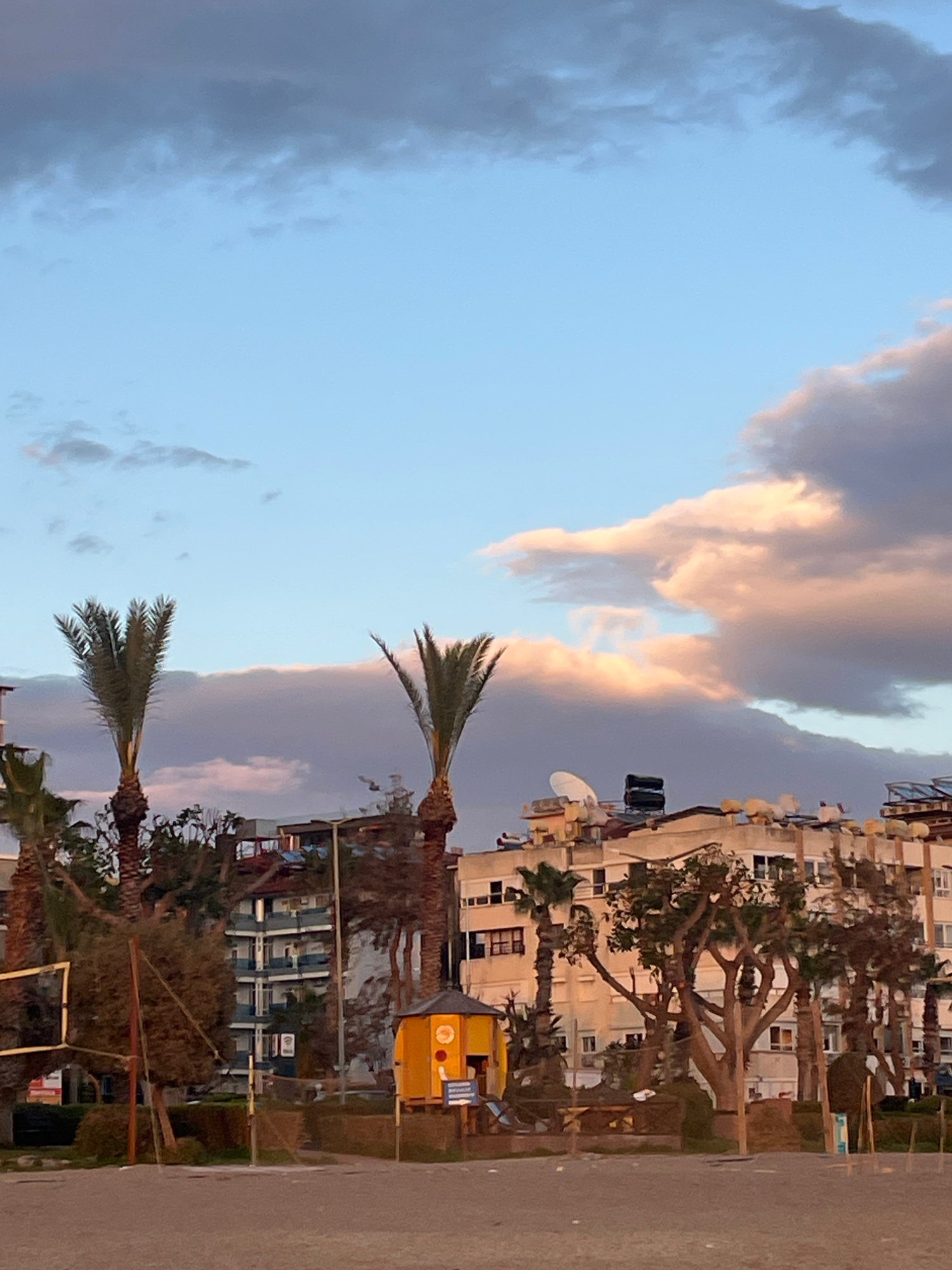 The image shows a view from a street in Alanya, Turkey. The sky is partially cloudy, with a mix of blue sky and gray clouds tinged with pink from the sunset. Palm trees line the street on one side, in…read more