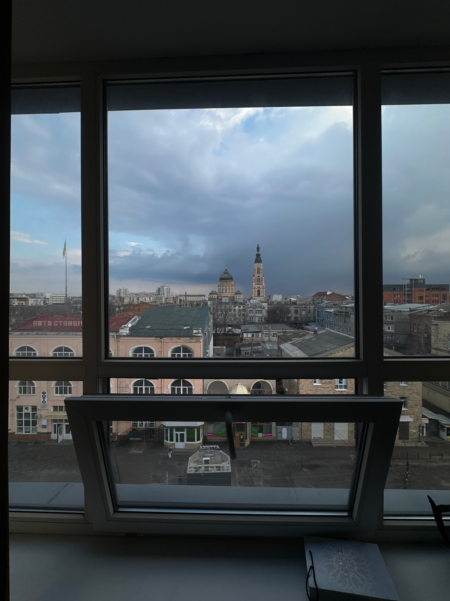 The image shows a view from a window of a building in Kharkiv, Ukraine. An open window pane is on the right side of the frame. Outside the window is a cityscape. The Dormition Cathedral and its bell t…read more