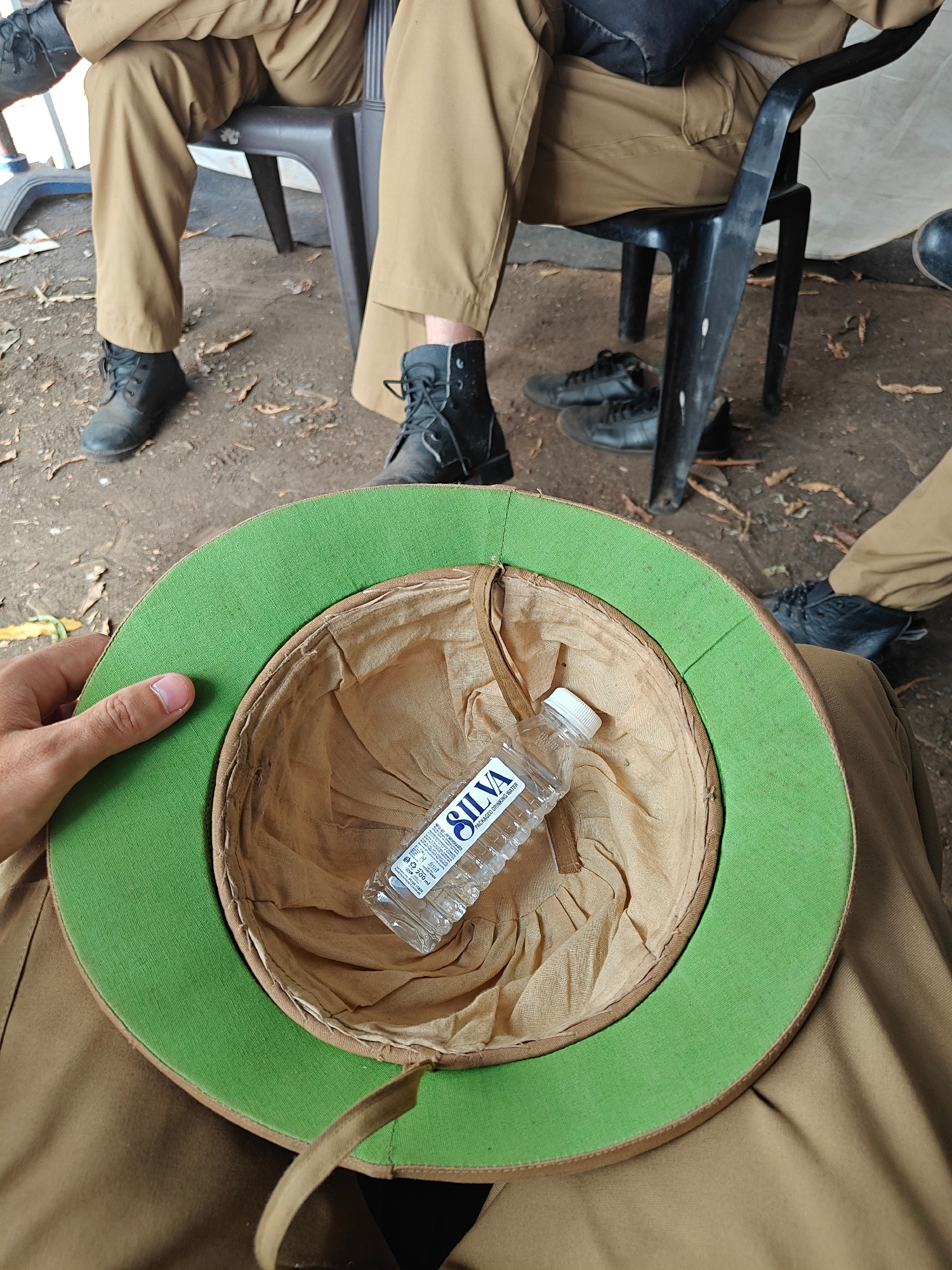 The image depicts a khaki pith helmet with a bright green brim, cradling a bottle of "SILVA" brand drinking water inside. The helmet is being held by a hand with a visible thumb. The setting appears t…read more