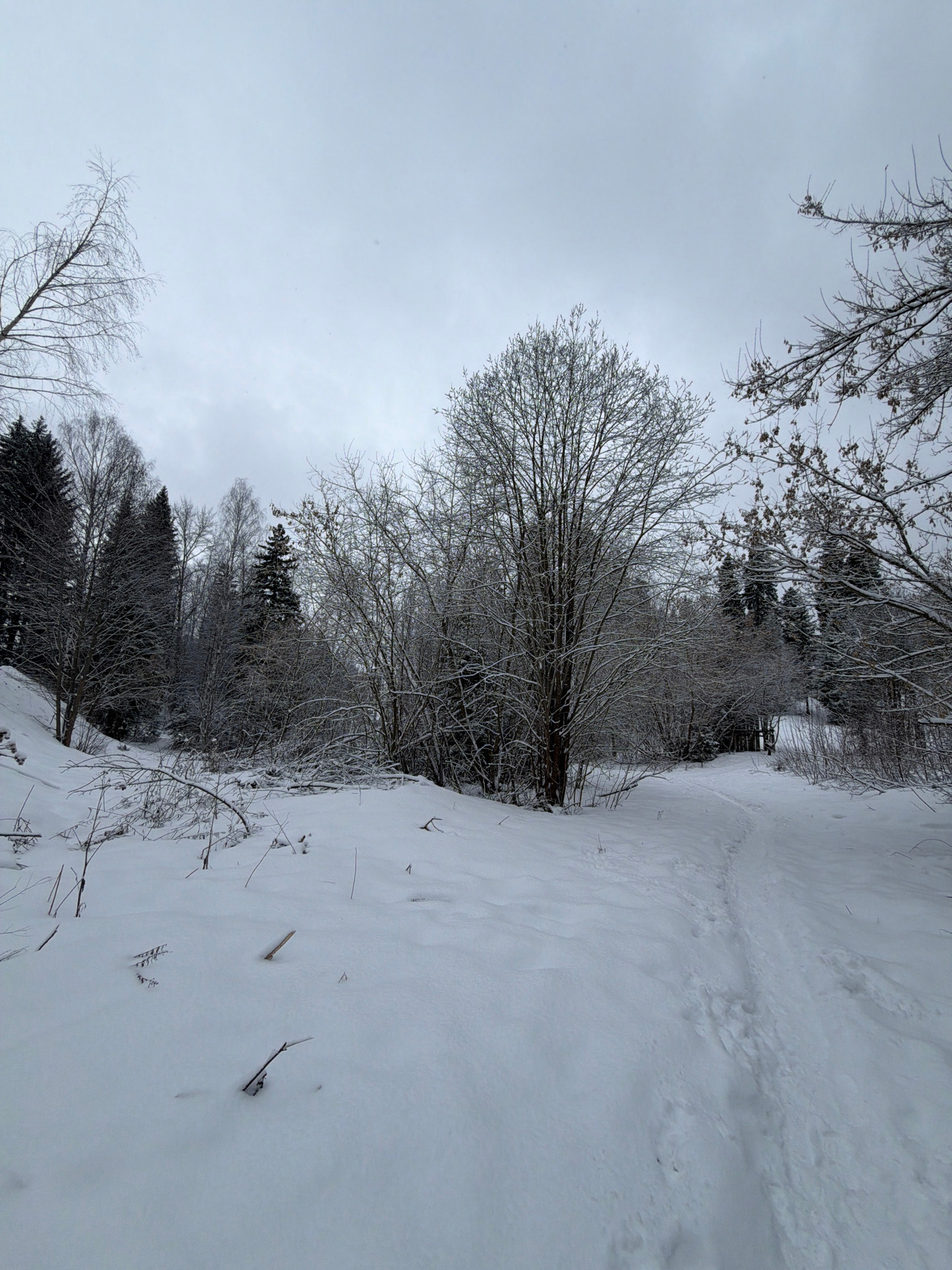 The image depicts a winter landscape in Izhevsk, Russia. The ground is covered in a thick layer of snow, with visible tracks suggesting pedestrian traffic. Bare trees and shrubs line the snow-covered…read more