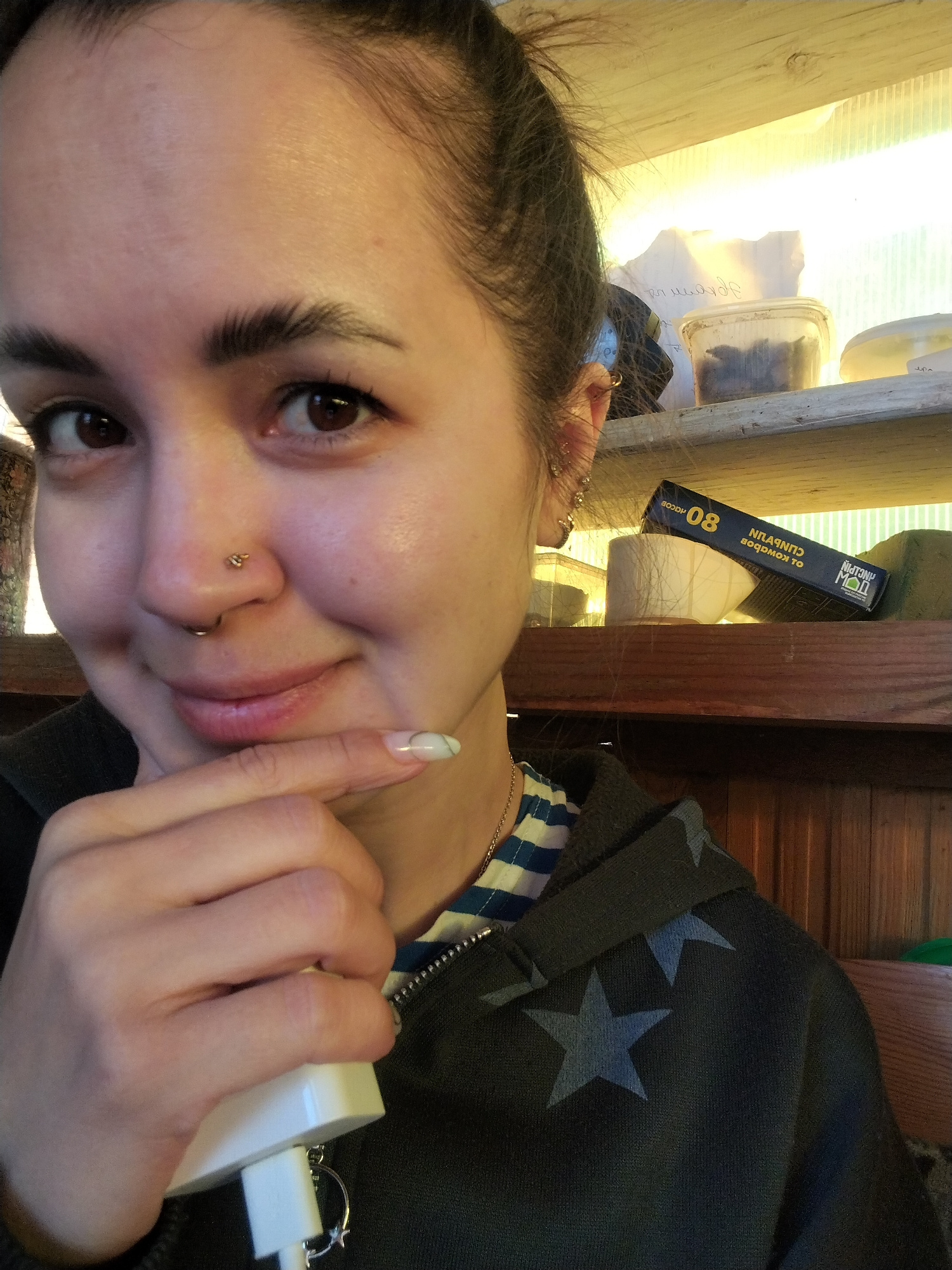 A woman with dark eyebrows and brown eyes is holding a white object in her hand and resting her chin on her finger. She has multiple earrings in her left ear and two nose piercings. She is wearing a s…read more