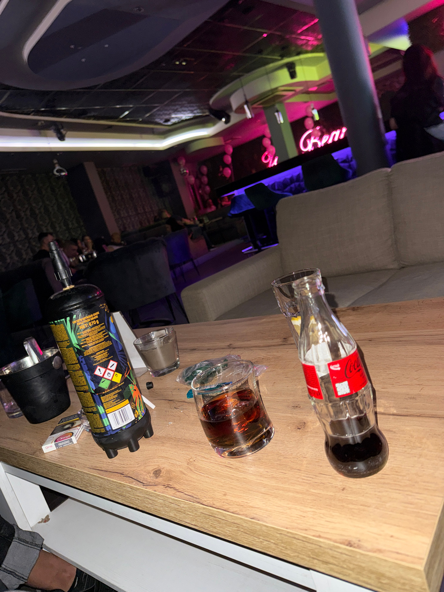 The image shows a tabletop scene with various items. On the table are an empty Coca-Cola glass bottle, a glass containing a dark liquid, an aerosol can with a colorful label, a lighter, and a pack of…read more