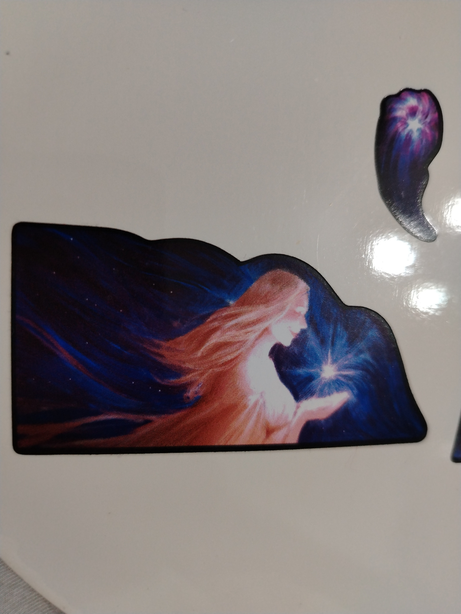 The image contains two stickers on a white surface. The larger sticker depicts a reddish-orange figure with flowing hair, seemingly a woman, against a backdrop of dark blue with starry accents. She isβ¦read more