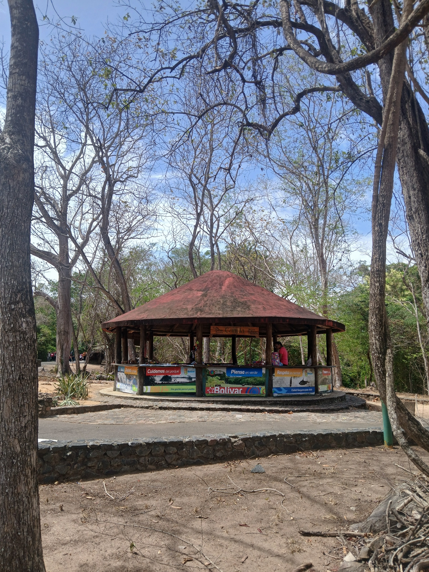 This outdoor image, taken in Ciudad Guayana, Venezuela, depicts a tranquil park scene under a bright, clear blue sky. The main subject is a rustic wooden gazebo or shelter with a reddish-brown roof, s…read more