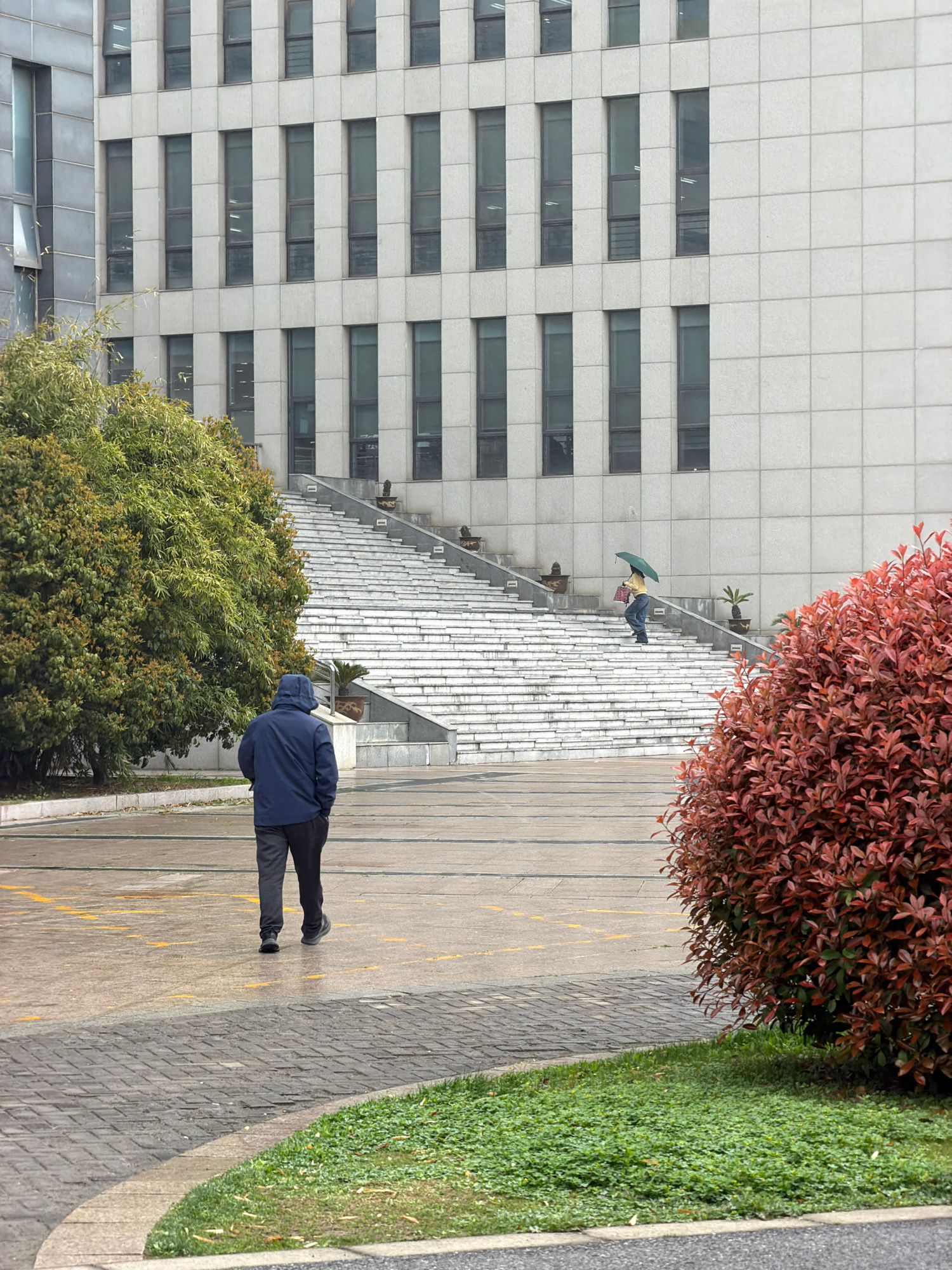 A pedestrian, clad in a blue hooded jacket and black pants, is walking along a paved pathway adjacent to a grass-covered area. Next to the grass is a red leafy bush. The pathway's surface texture is d…read more