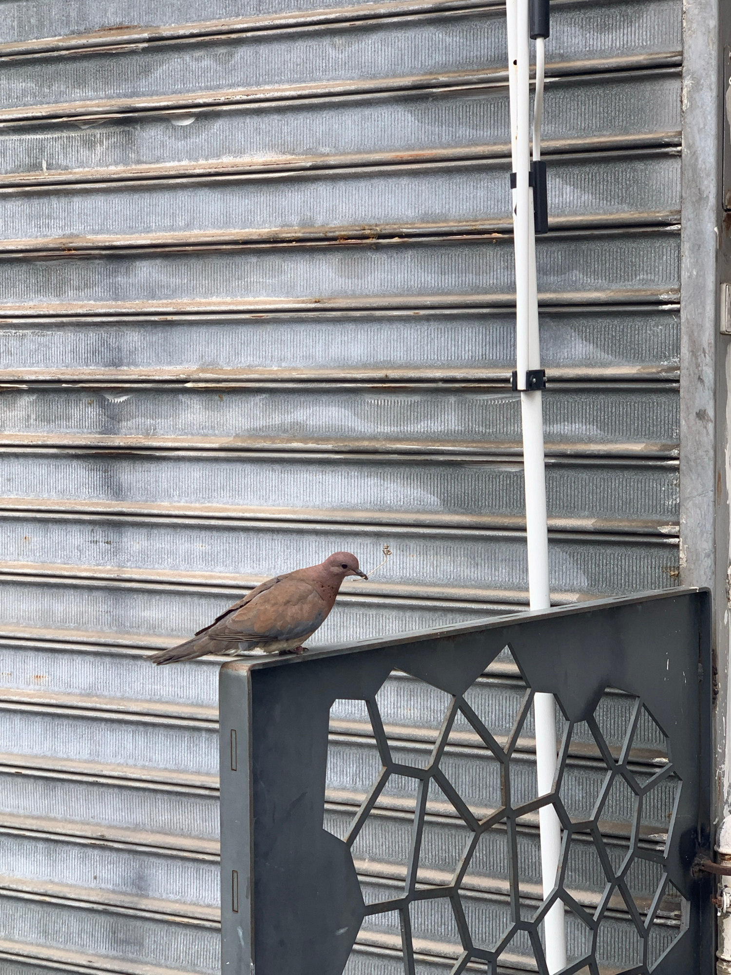 A Eurasian collared dove (Streptopelia decaocto) is perched on the edge of a gray metal grate structure, likely an air conditioning unit or ventilation system. The backdrop is a corrugated metal ceili…read more