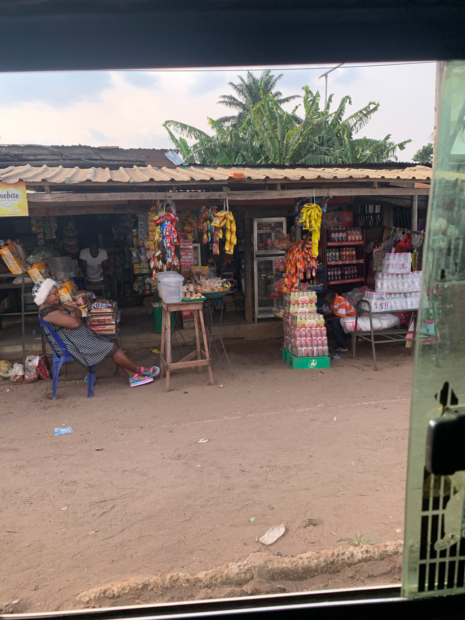 A medium-shot photograph shows a view of a roadside shop from a vehicle, likely a bus, in Owerri, Nigeria. The shop displays a variety of snacks and drinks. The roof of the shop is made of corrugated…read more
