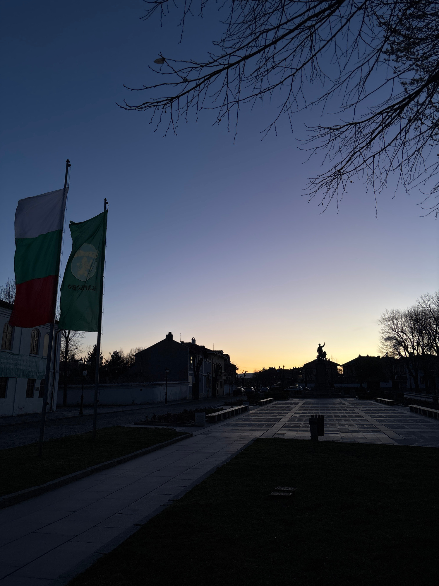 The image depicts a view in Karlovo, Bulgaria at dusk. A paved path leads toward a silhouette of a statue on a distant raised platform. Buildings line the path, some dark, others showing windows. In t…read more