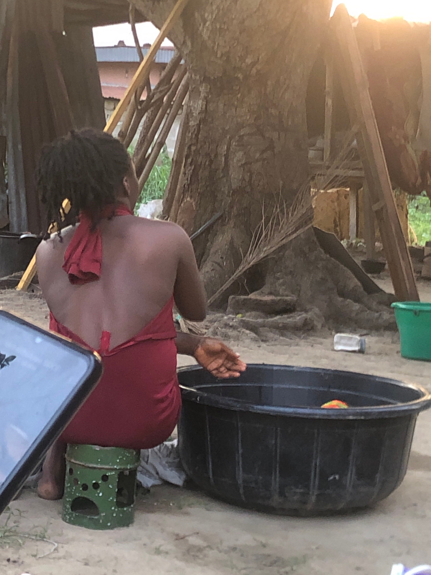 A woman with dreadlocks, wearing a red dress with a low back, is crouching next to a large black tub outside in Atani, Nigeria. She is seated on a green perforated container. A green bucket and a smalβ¦read more