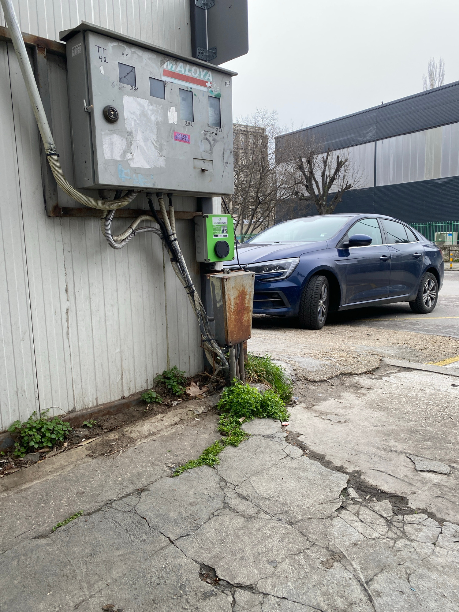 The image depicts a street scene in what is presumed to be Varna, Bulgaria. A blue car is parked close to an electrical box affixed to a building. The electrical box is gray and displays the word "MAL…read more