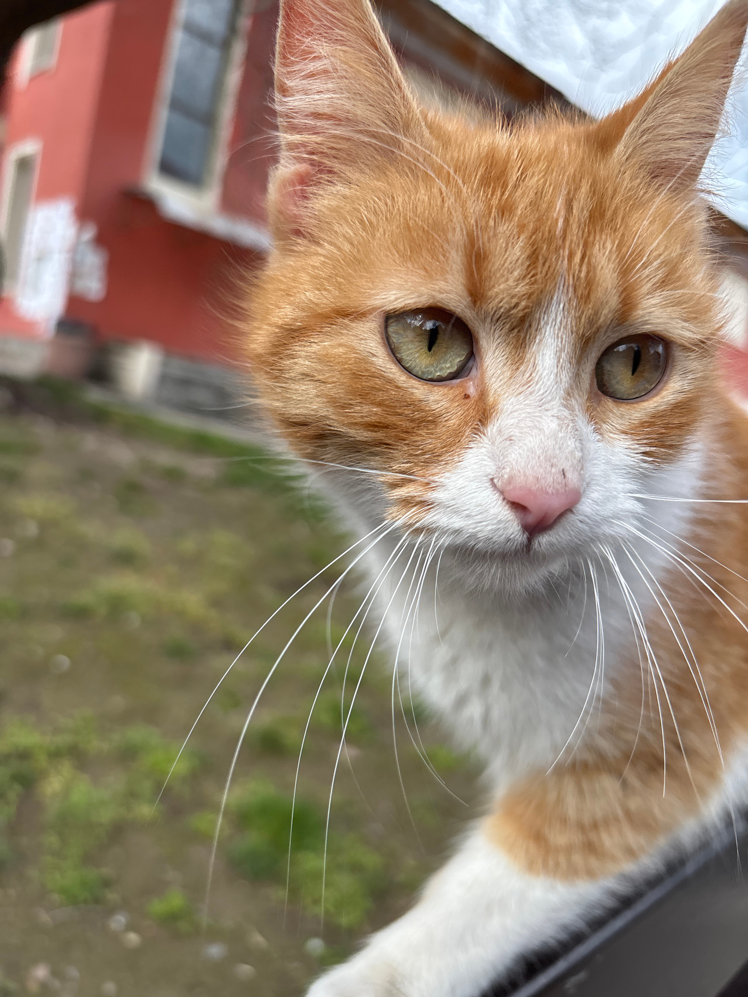 A close-up, downward-facing perspective captures an orange and white cat with green eyes and a pink nose. The cat's face fills much of the frame. The cat's whiskers are prominently displayed, stretchi…read more