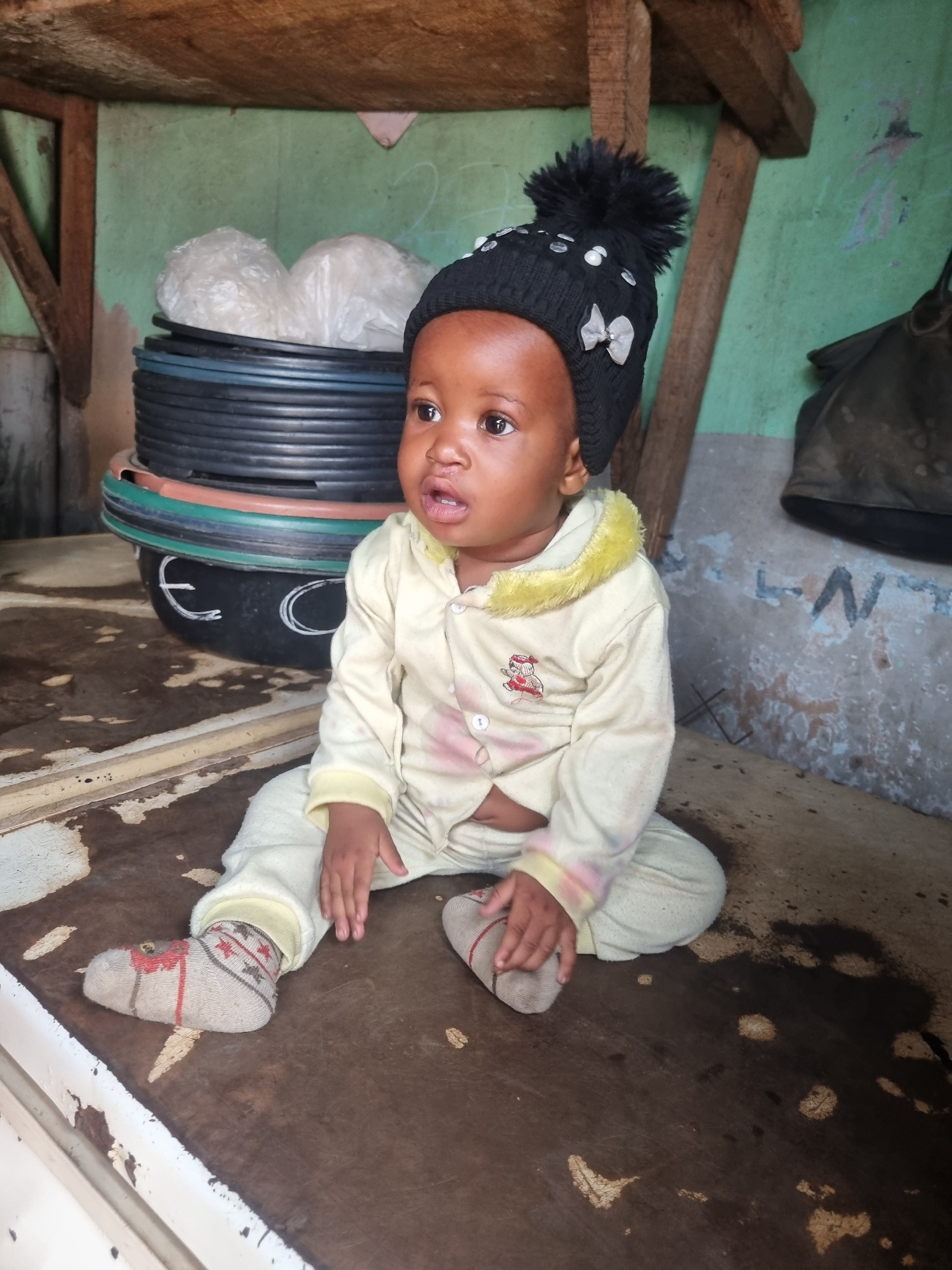 A young child wearing a black knit hat with a pom-pom and a light-colored pajama set sits on a dark, weathered surface. One foot is in a patterned sock. The child is partially leaning against a stack…read more
