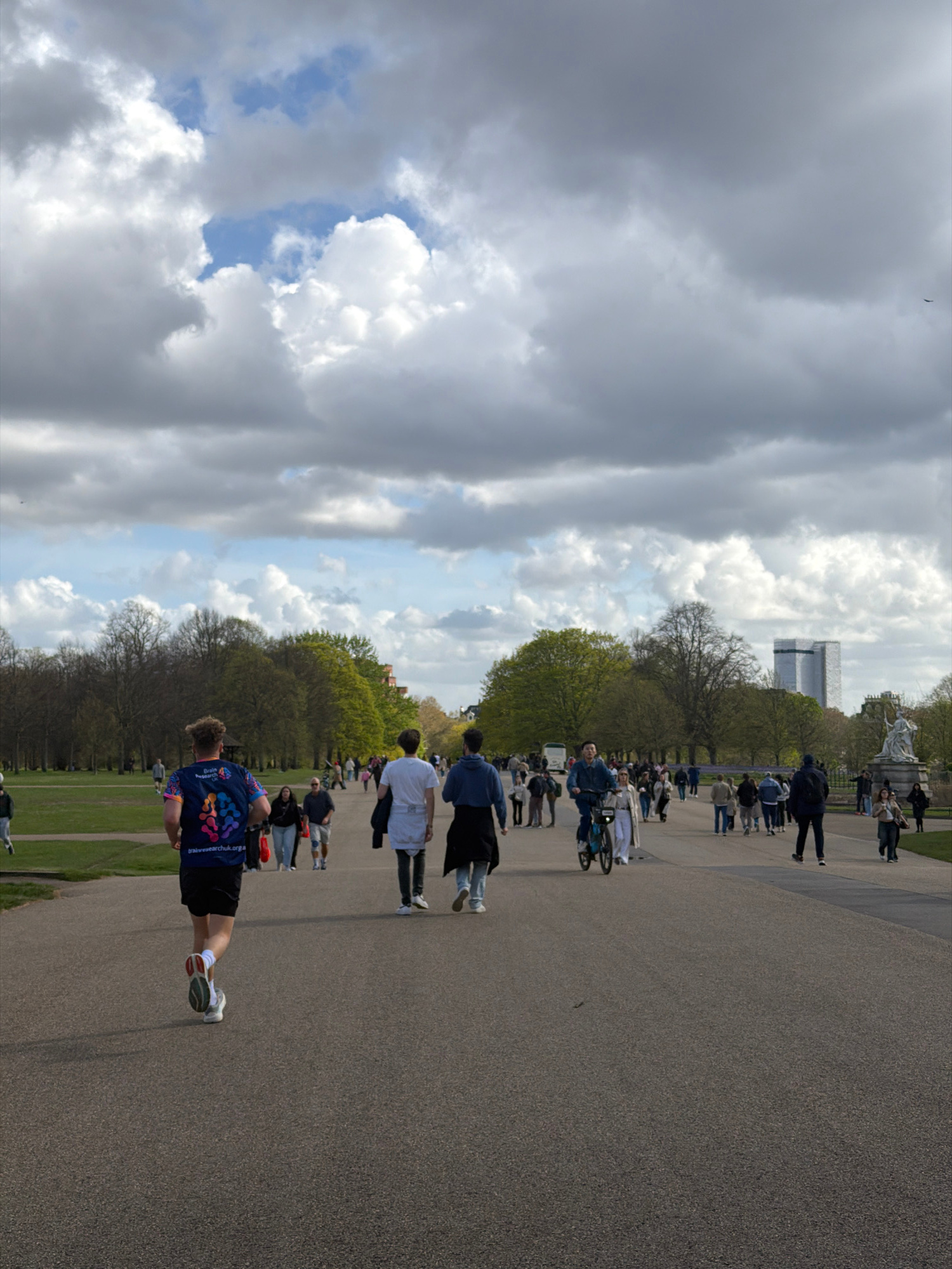 The image shows a scene in Hyde Park, London, United Kingdom. A paved path stretches through the park, lined with trees and grass on one side. Numerous people are walking and cycling along the path. B…read more
