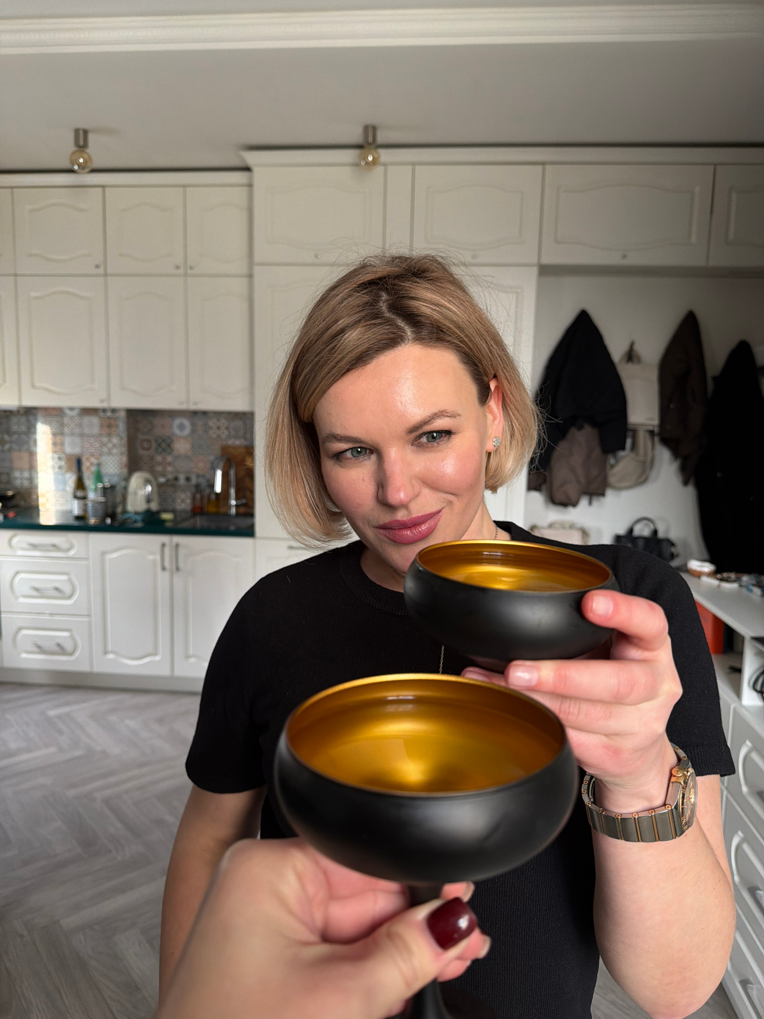 The image shows a woman holding two black and gold bowls in what appears to be a domestic kitchen. The bowls have a matte black exterior and a glossy gold interior. The woman is wearing a black top an…read more