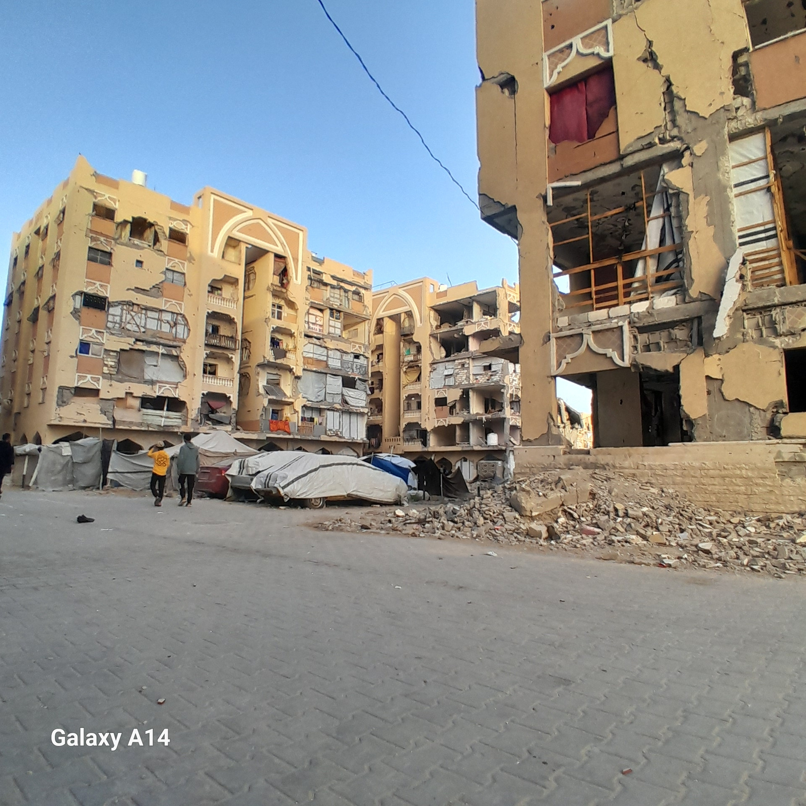 The image shows buildings in Khan Yunis, Palestinian Territory that have been severely damaged, likely from conflict or bombing. The structures have multiple floors with visible destruction, including…read more