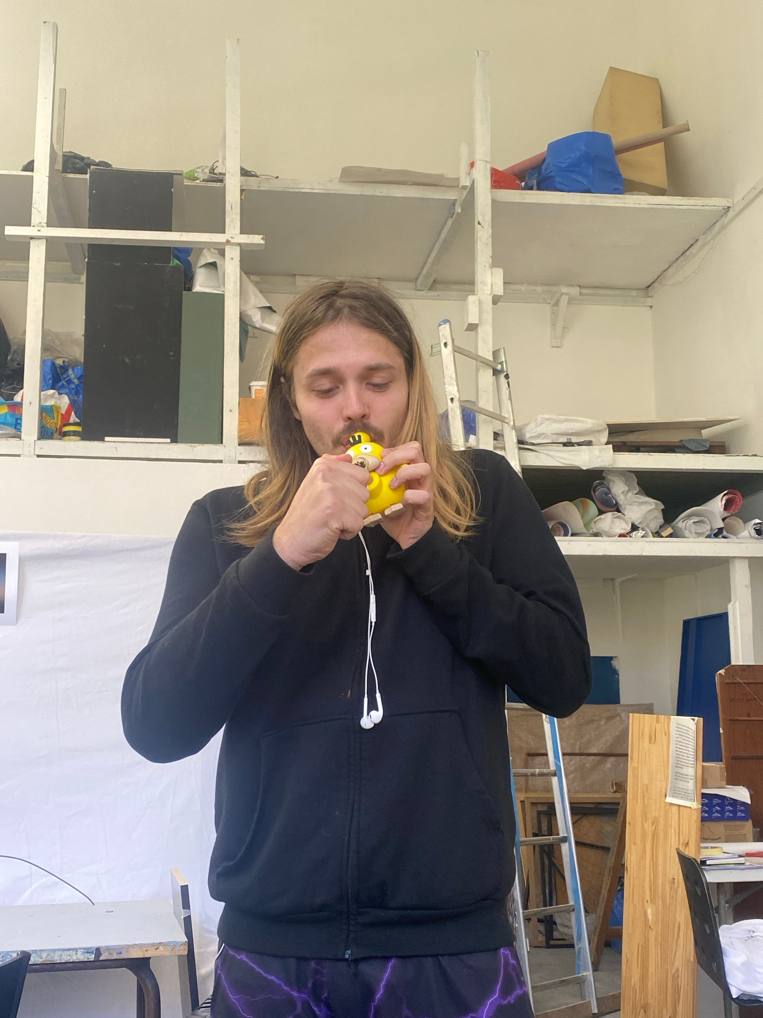A person with long blonde hair is indoors, holding a yellow toy up to their mouth. They are wearing a black zip-up hoodie over patterned pants. The background includes white shelves with various items…read more