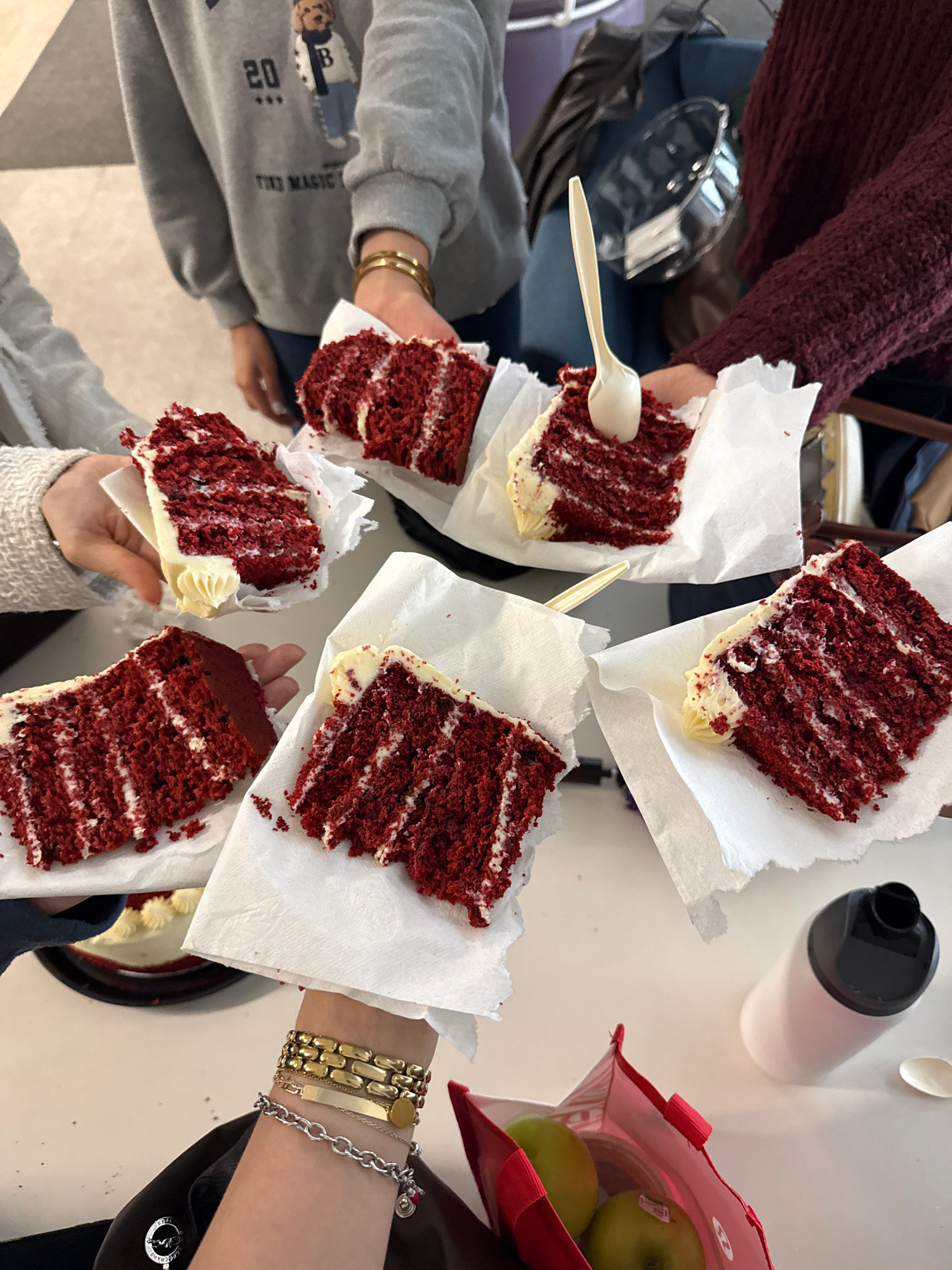 The image shows a group of people holding pieces of red velvet cake on napkins. The camera is positioned overhead, providing a bird's-eye view of the scene. There are five pieces of cake visible, each…read more