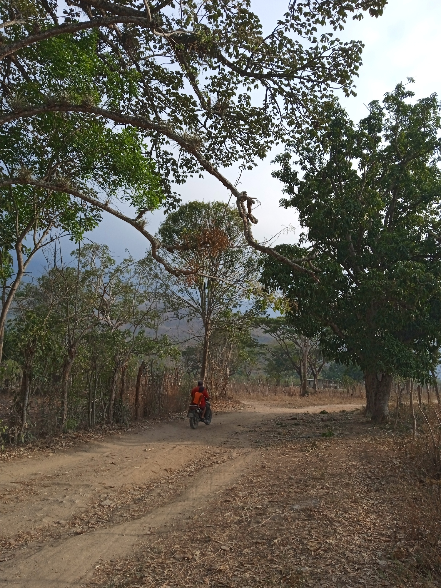The image shows a dirt road leading into a wooded area in Montalbán, Venezuela. A person in an orange shirt is riding a motorcycle along the road, moving away from the camera. Trees line both sides of…read more
