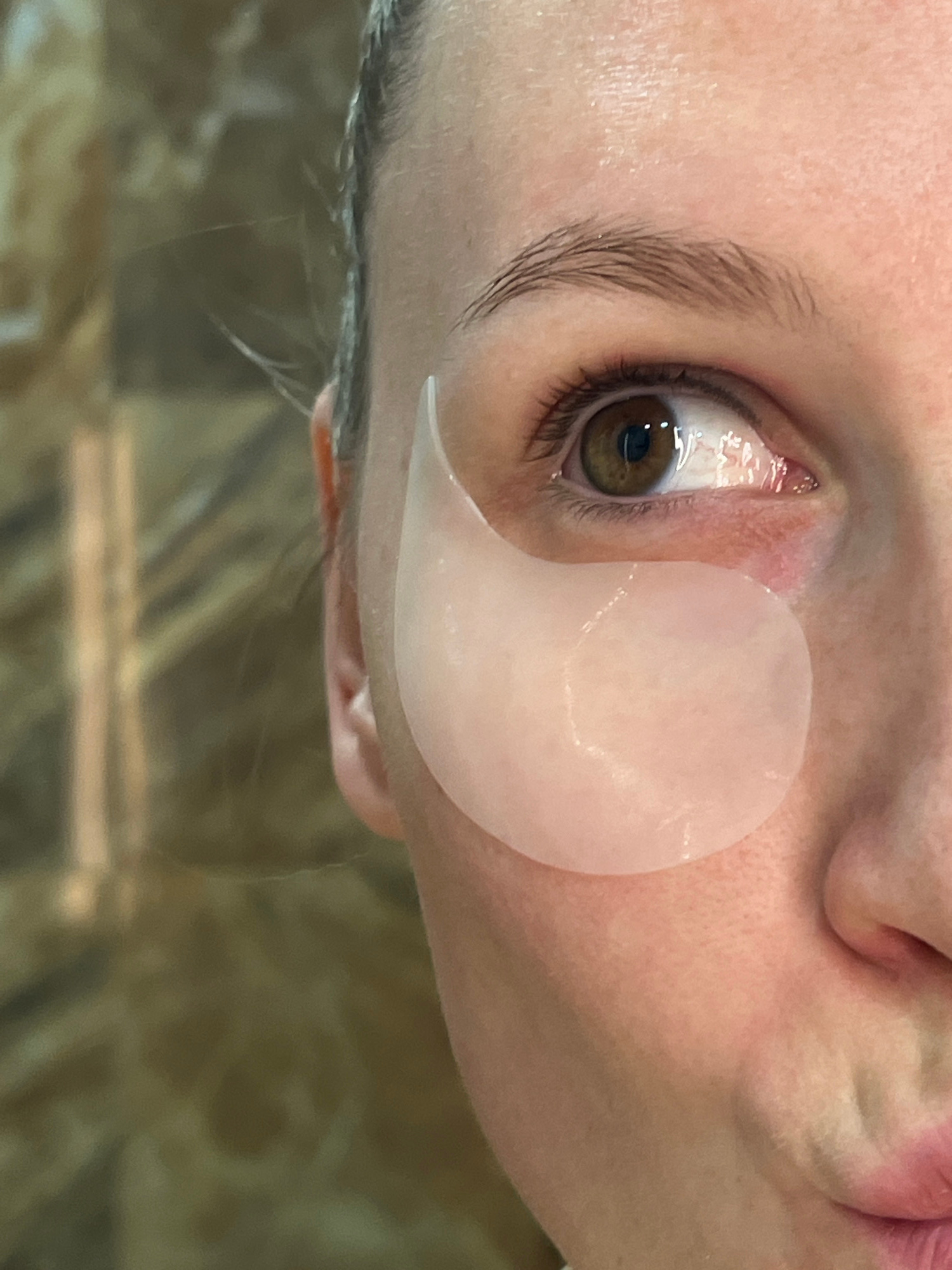 A close-up, slightly rotated image shows a person's face with a light pink under-eye patch applied below the left eye. The person has fair skin, brown eyes, and light eyebrows. The background is blurr…read more