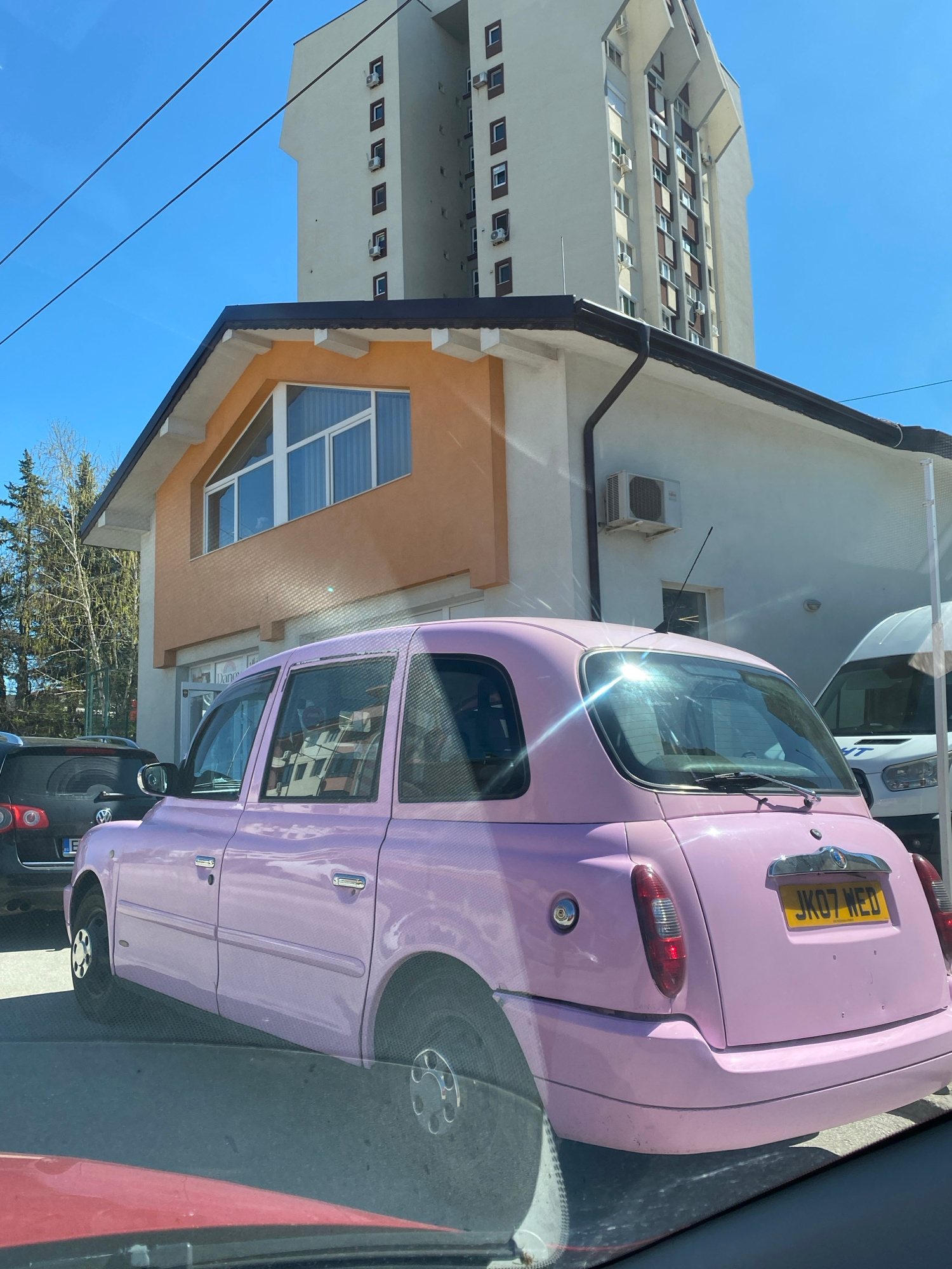 The image, taken from inside a car looking out through the windshield, features a pink car parked on a street. The license plate on the pink car reads "JK07 WED". Behind the pink car is a black SUV.…read more