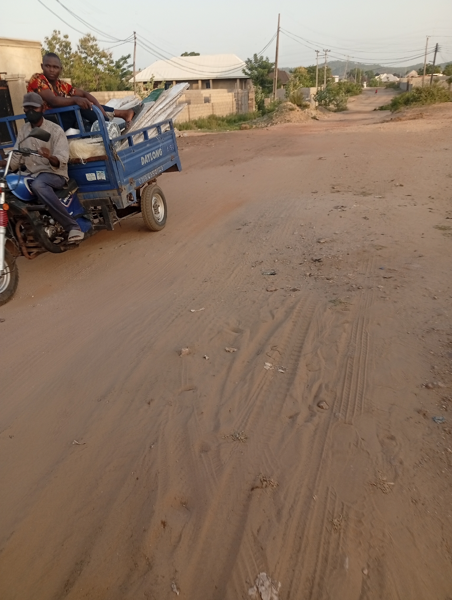 The image depicts a road in Adankolo, Nigeria, with a blue "DAYLONG" three-wheeled vehicle loaded with metal sheets and other materials on the left side of the frame. Two men are on the vehicle; one i…read more