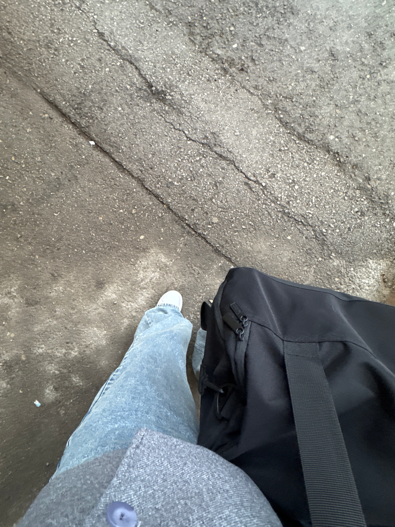 The image shows a view from above of a section of cracked concrete sidewalk in Perm, Russia. A portion of a black duffel bag occupies the upper right quadrant. A person wearing light blue jeans, white…read more