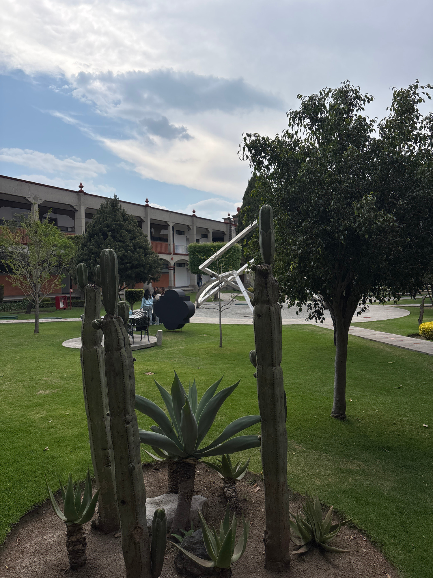The image depicts a garden scene in San Andrés Cholula, Mexico. A well-manicured lawn is bordered by several tall cacti and an agave plant in the foreground. In the background, a building with multipl…read more