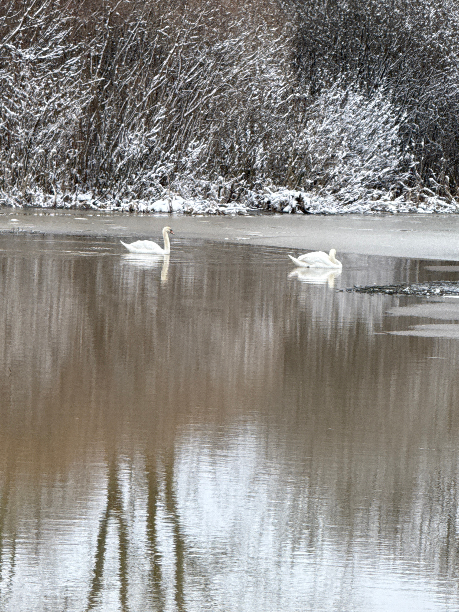 The image shows a winter scene of a river or lake, likely in the vicinity of Karsha, Russia, based on the presence of icy conditions and the sparse, snow-covered vegetation. On the left is a snowy ban…read more