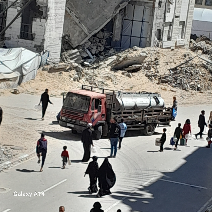 This image depicts a street scene in Khan Yunis, Palestinian Territory, marked by extensive urban destruction. In the background, multiple concrete buildings are severely damaged or partially collapsed, with large quantities of rubble, rebar, and sand debris accumulated at their bases. A white, possibly canvas, tent structure is visible on the far left. In the midground, a red, forward-control truck with a silver cylindrical water tank mounted on its rear flatbed is positioned on a paved road. Approximately 15 to 20 individuals are present across the frame, engaged in various movements. People are walking in multiple directions, many carrying white plastic containers, bags, or other items. Notable individuals include a person in dark clothing walking left and carrying two white containers; a small child in a red shirt walking right, holding a white object; two figures, likely women, in black abayas or niqabs walking away from the viewer in the foreground; and a group of individuals moving from right to left across the midground behind the truck, several of whom are carrying bags or containers. One person is seated on the rear of the water tanker truck. The scene is illuminated by strong daylight, casting prominent shadows on the paved road. | Open Wire