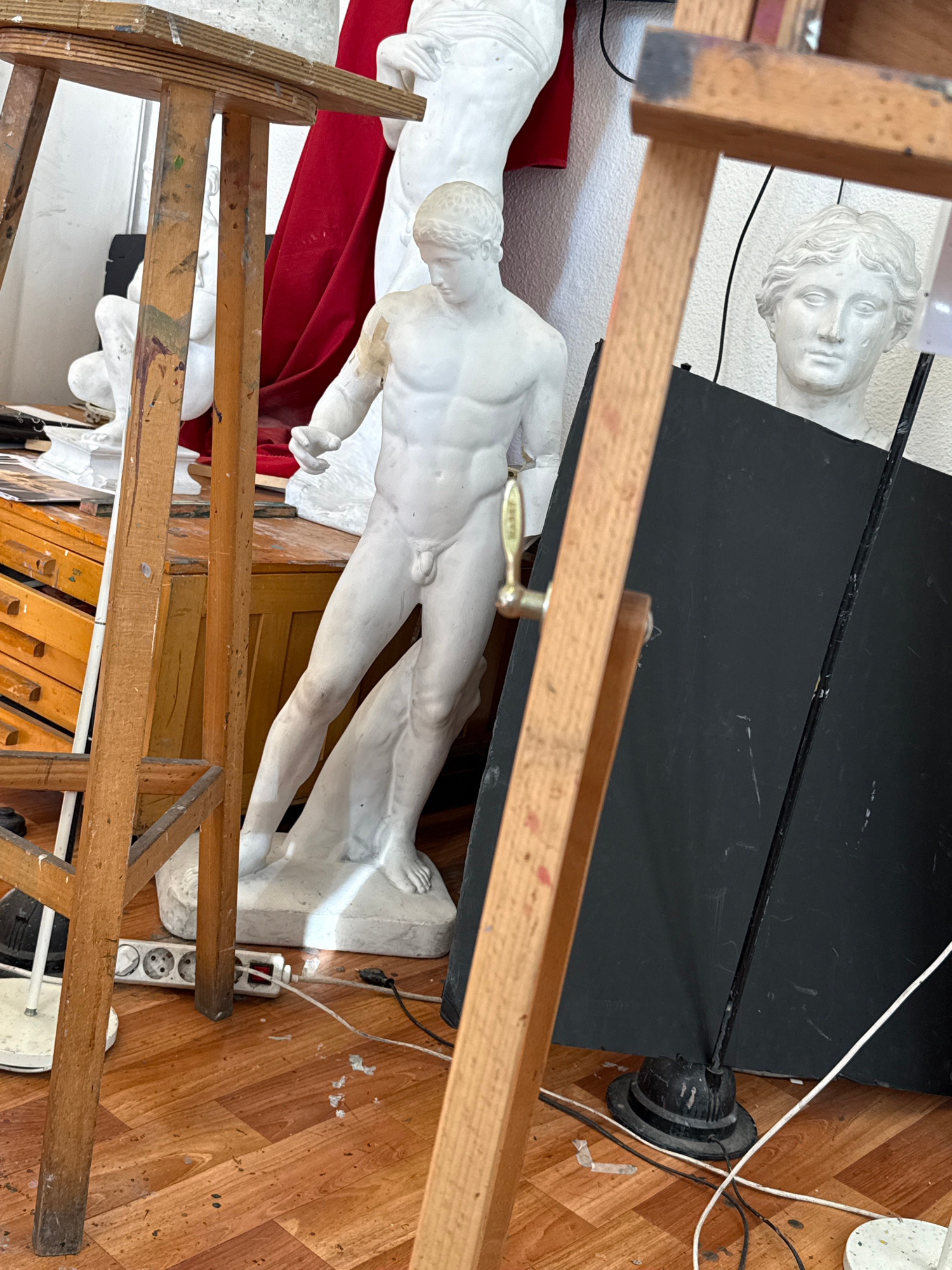 The image captures an artist's studio, likely in Madrid, Spain, given the presence of classical plaster casts, a common feature in art studios worldwide. The scene is cluttered and disorganized, domin…read more