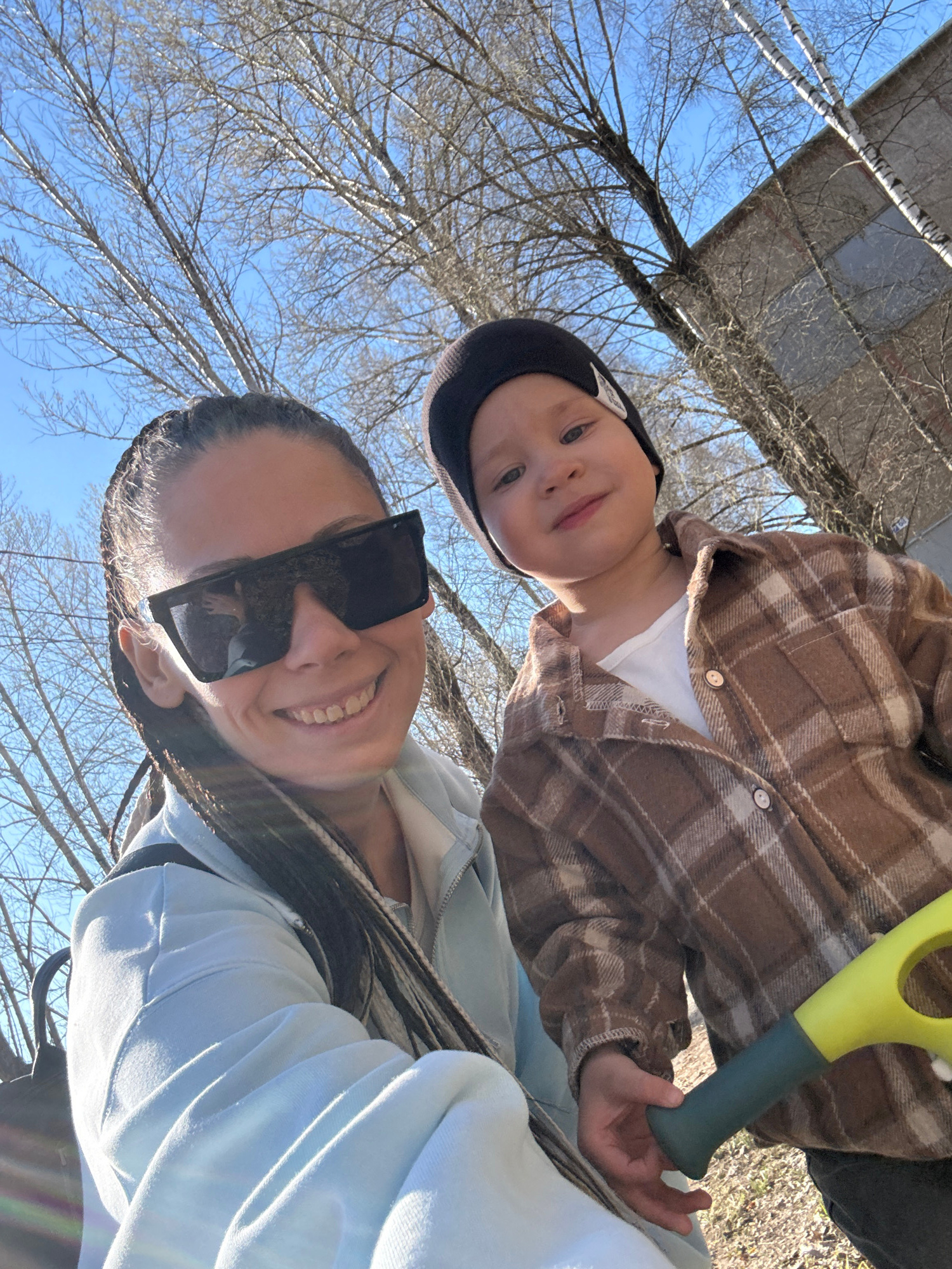 This image captures a cheerful outdoor moment in Rusanovo, Russia, featuring an adult and a child. The photo is a selfie taken from a low angle, looking upwards towards a bright, clear blue sky and ba…read more