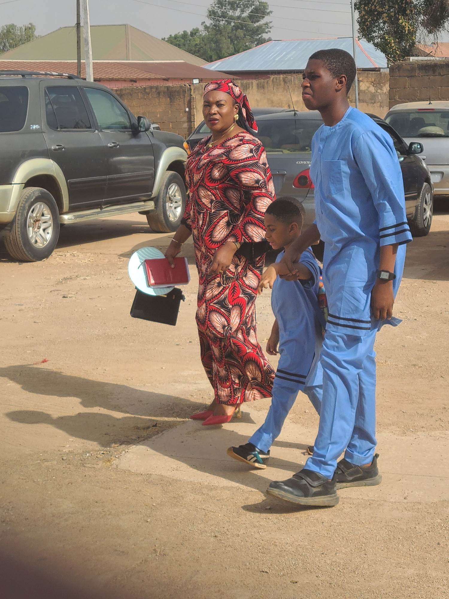 The image shows a woman and two boys standing on a dirt ground in Gura Top, Nigeria. The woman is wearing a red and brown patterned dress with a matching headscarf and red shoes, she is holding a lighβ¦read more