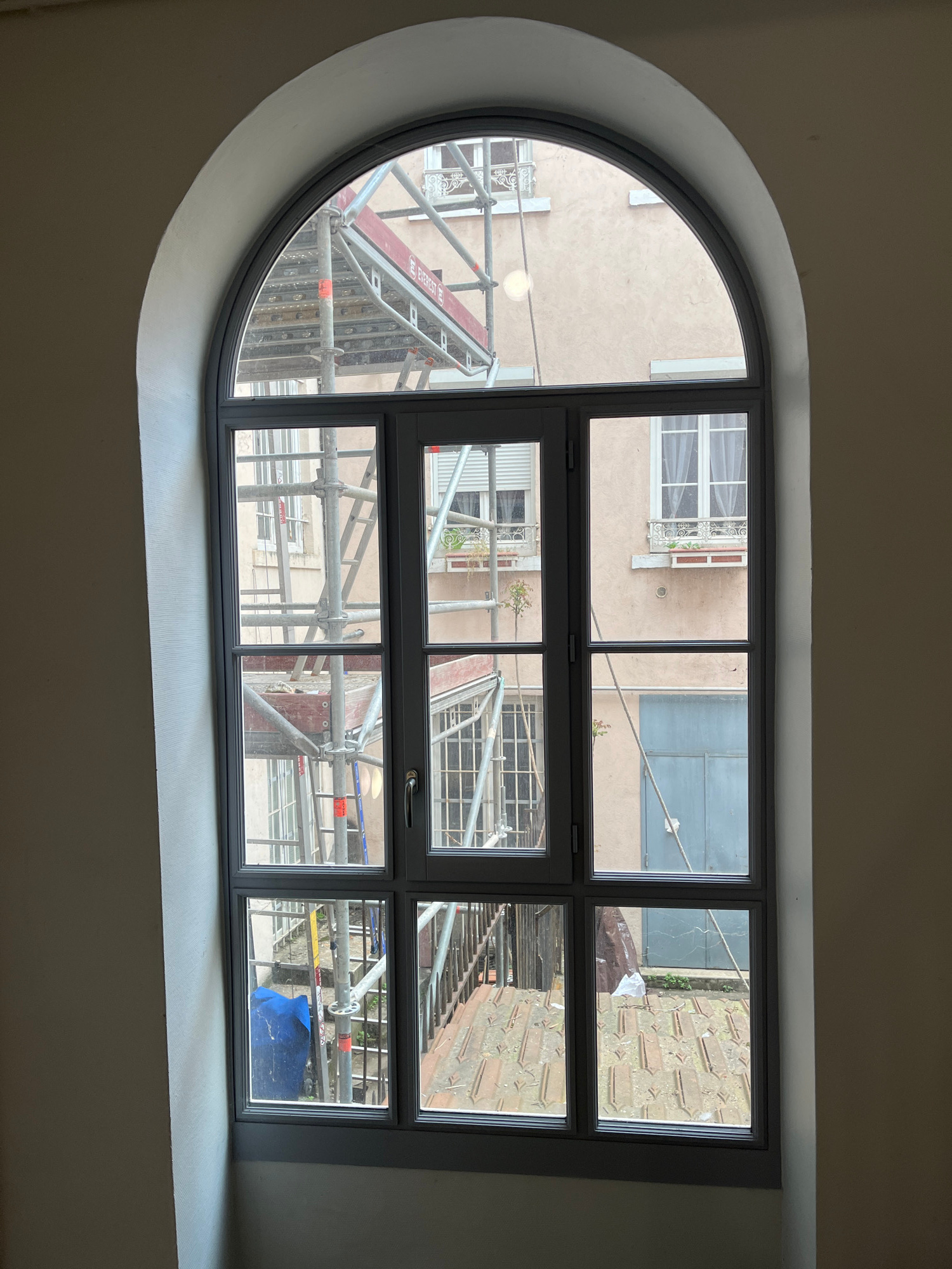 The image displays an interior view looking outwards through a unique window. The window, set in a plain, light-colored wall, has an oval or arched shape on its left side that smoothly transitions int…read more