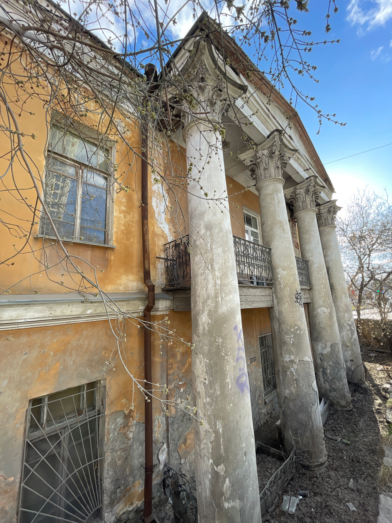 An exterior shot of the abandoned Sevastianov Estate in Yekaterinburg, Russia, reveals a deteriorated, three-story building. The facade is a mix of peeling, yellow-toned stucco and crumbling, gray-whi…read more