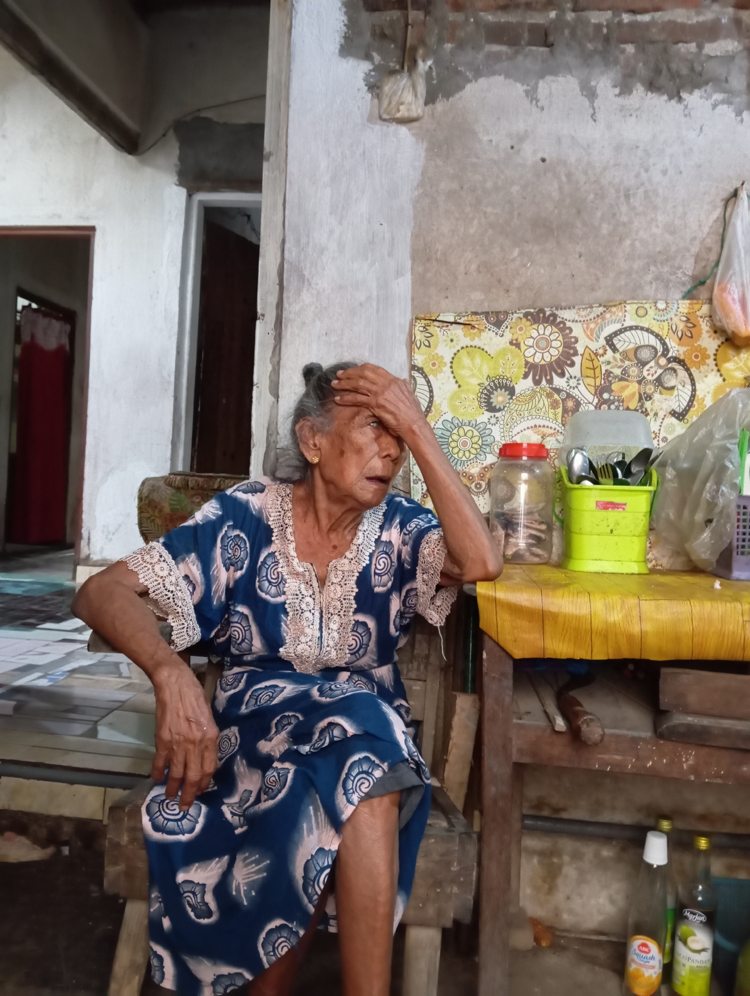 An elderly woman is lying down, resting her hand on her forehead, dressed in a blue and white patterned dress with lace trim. She is positioned near a cluttered area that includes a yellow and floral…read more