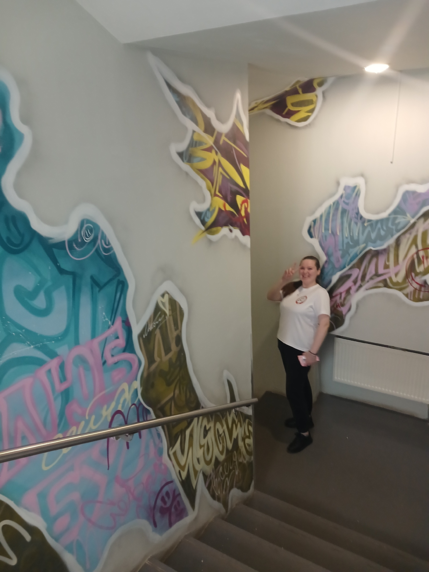 The image shows a woman in a white T-shirt and black pants standing in a stairwell. She is smiling and holding up two fingers in a peace sign. The walls of the stairwell are covered in colorful graffiβ¦read more