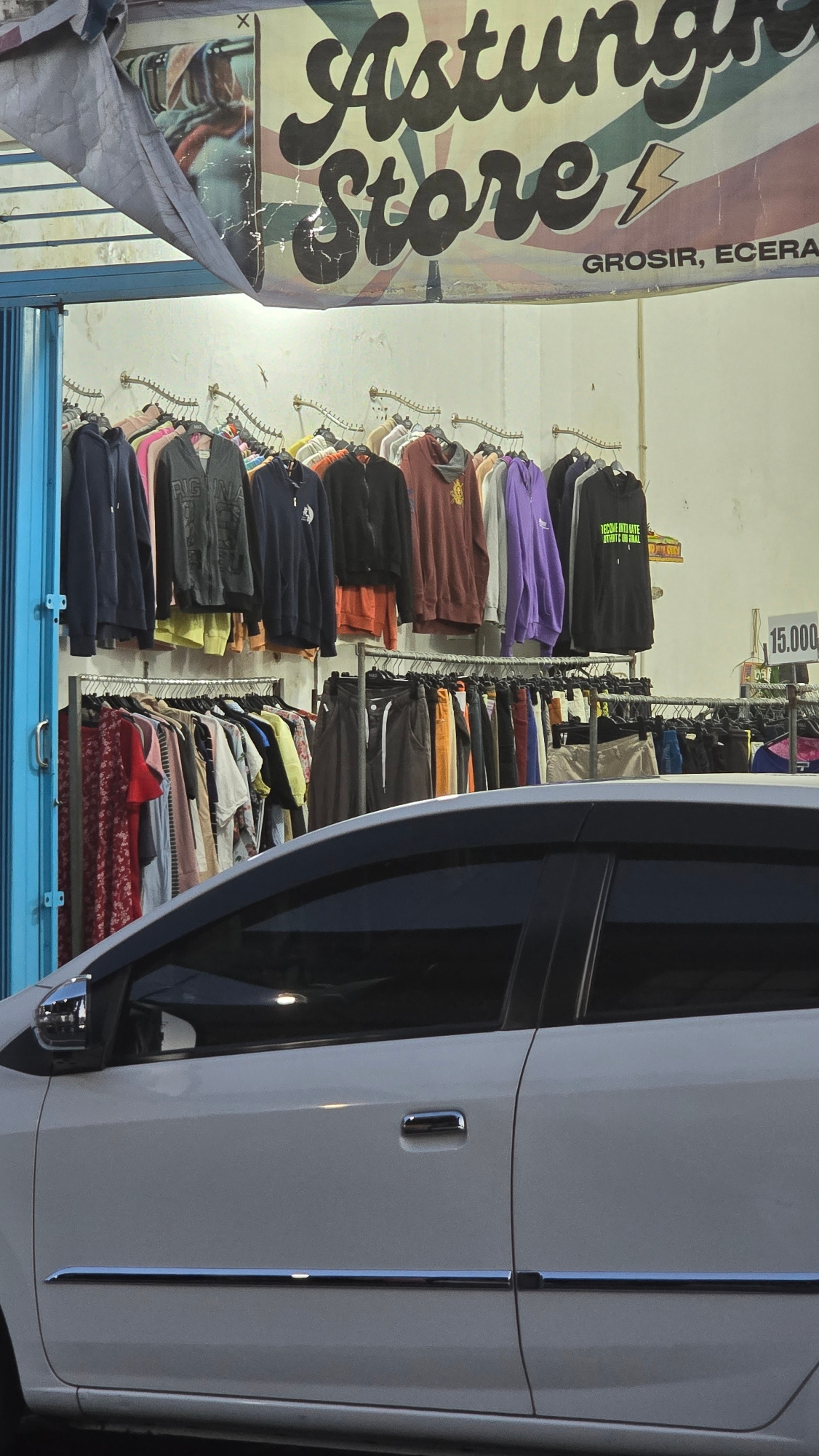The image captures a commercial scene, likely a market stall or an open-front shop. On the right, a white car, possibly an SUV or van, is partially visible, showing its passenger side with dark window…read more