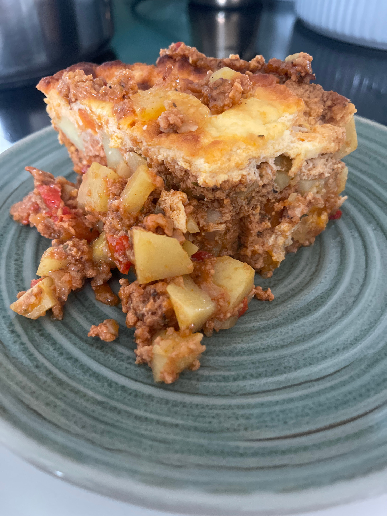 A close-up shot displays a portion of what appears to be a baked dish served on a round, patterned ceramic plate. The dish consists of layers, possibly including potatoes and minced meat, covered with…read more