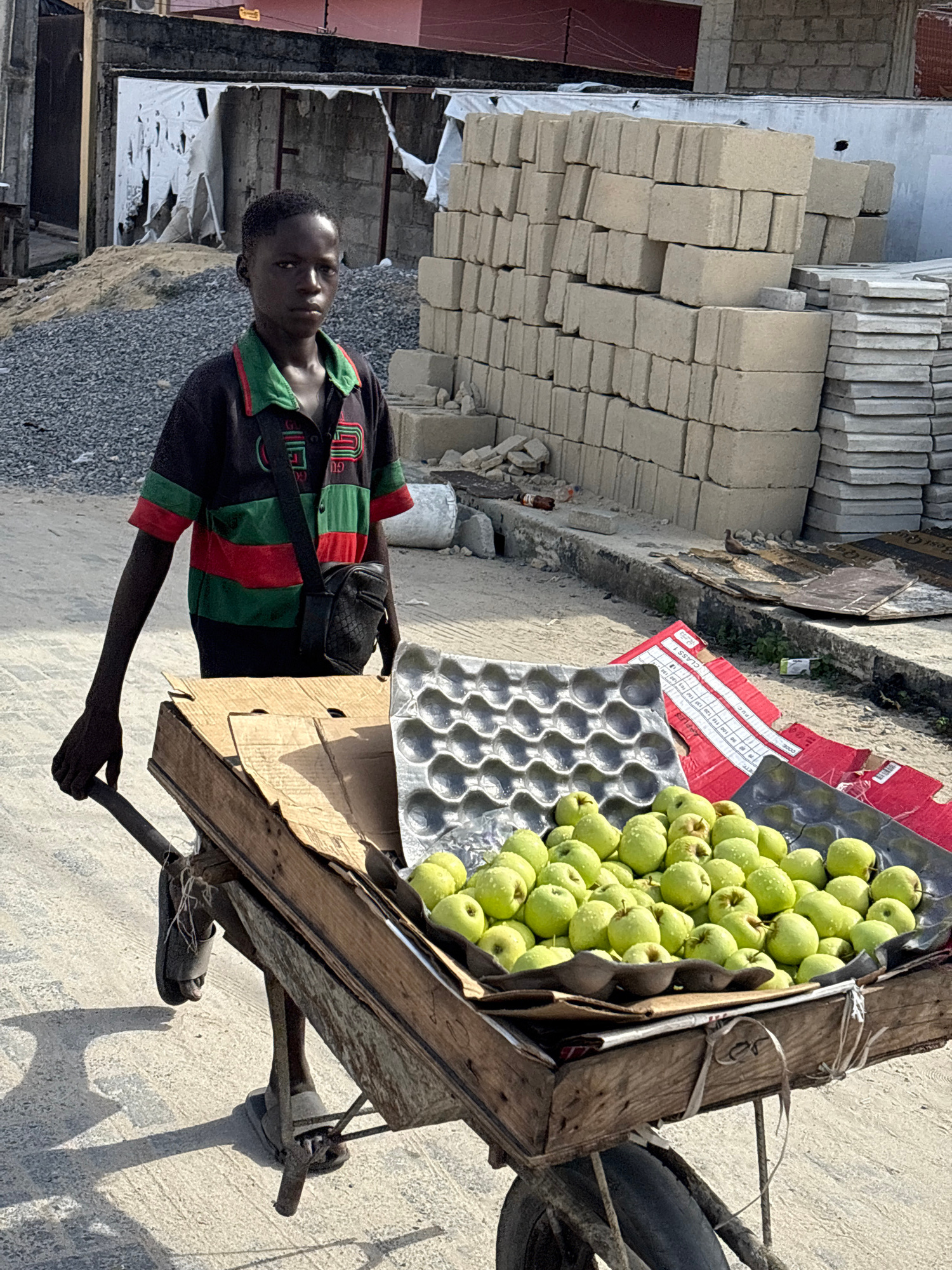 In Igboefon, Nigeria, a young man in a black, red, and green striped shirt stands next to a wheelbarrow filled with green apples. The wheelbarrow also contains a gray egg crate. A pile of concrete blo…read more