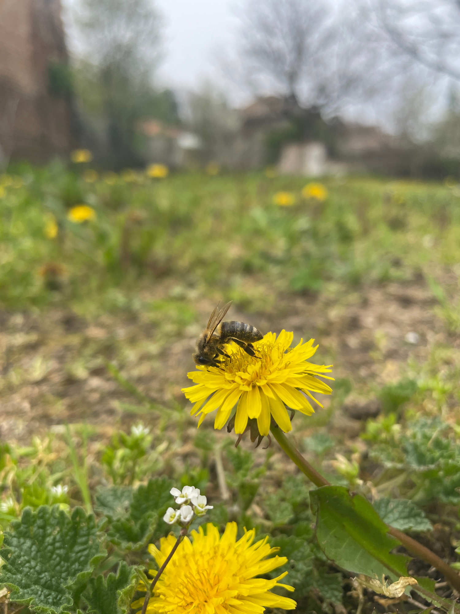 A bee is on a dandelion flower in a grassy area. There are white flowers and green foliage in the foreground. In the background, there is a blurred view of a building and sky. The exact location withi…read more