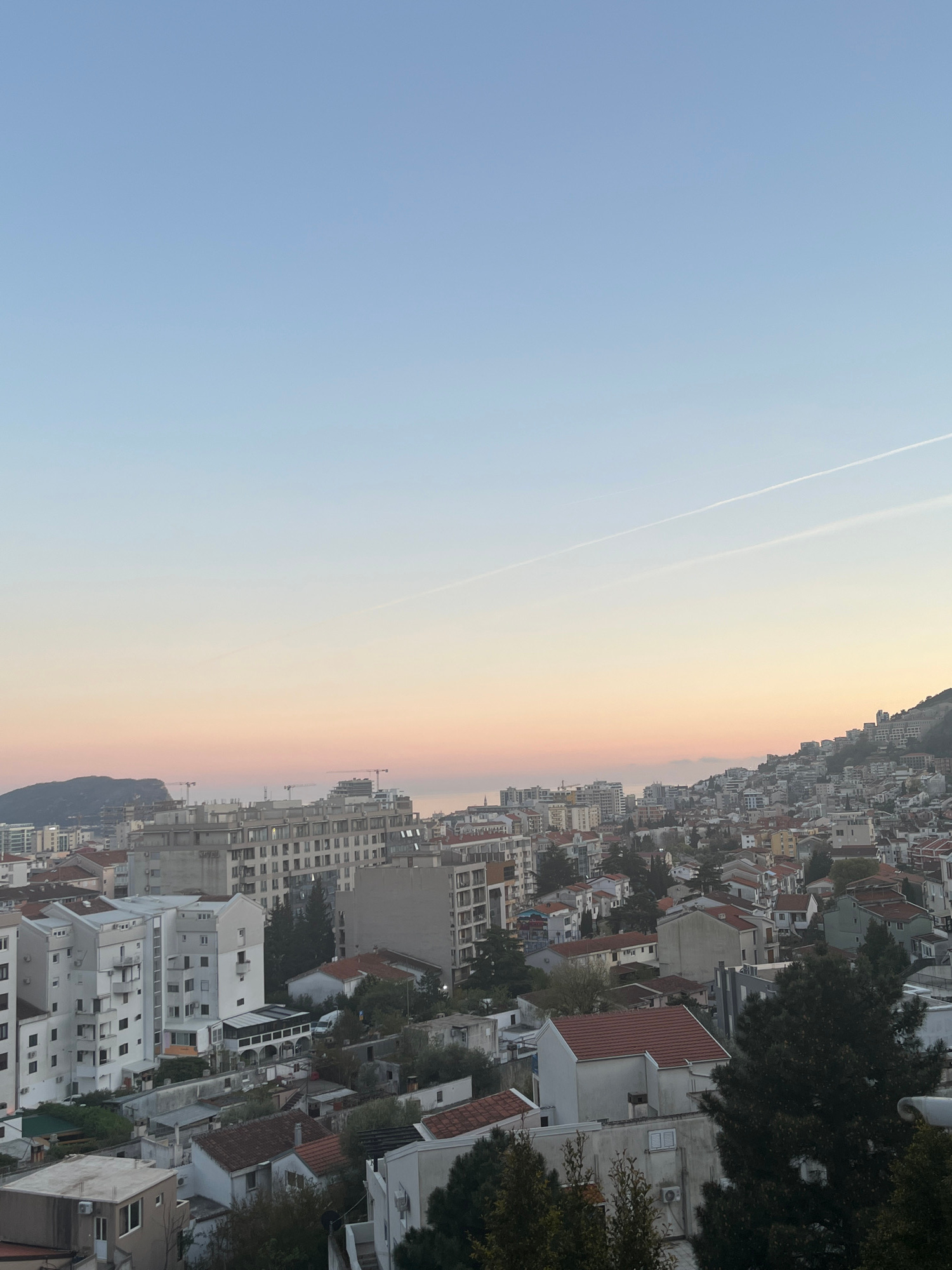 The image shows a portion of the city of Budva, Montenegro, taken from an elevated perspective, possibly a hillside or a tall building. The cityscape is densely packed with buildings of various sizes…read more