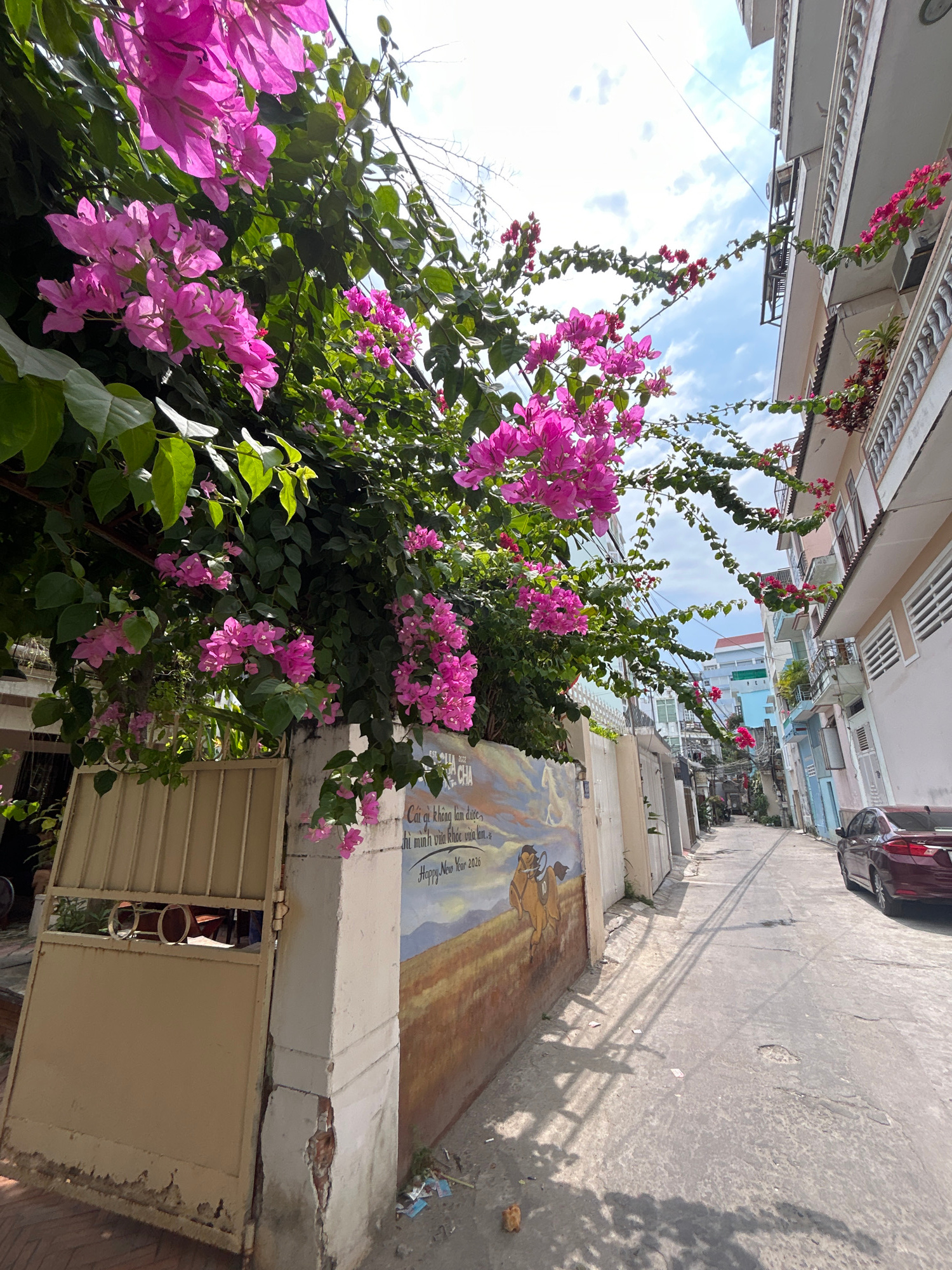 This image captures a vibrant street scene in Bắc Nha Trang, Vietnam, viewed from a low angle looking along a narrow thoroughfare. The most prominent subject is a large, flourishing bougainvillea plan…read more